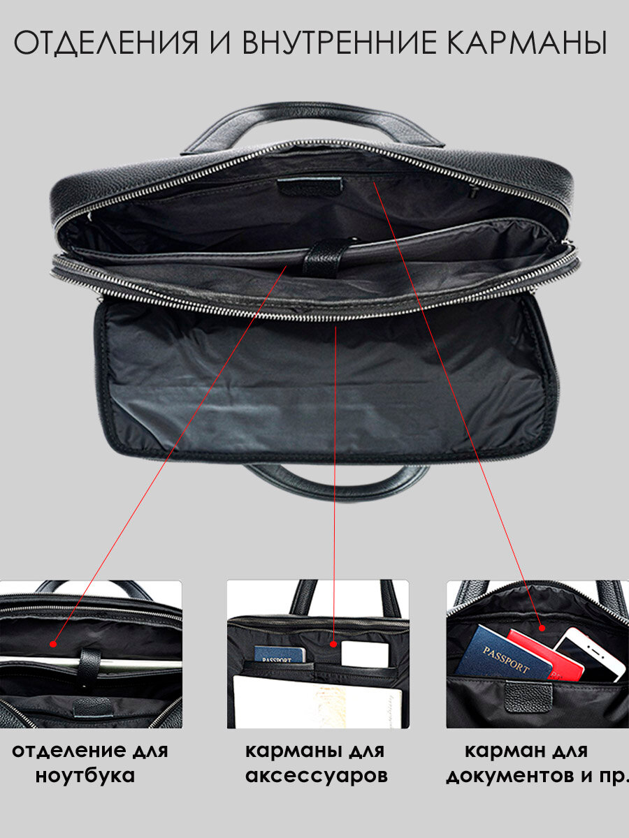 Сумка для ноутбука 15.6" кожаная, портфель мужской, для документов, с креплением на чемодан, 40х30см RAYNFIELD - Черная информация: