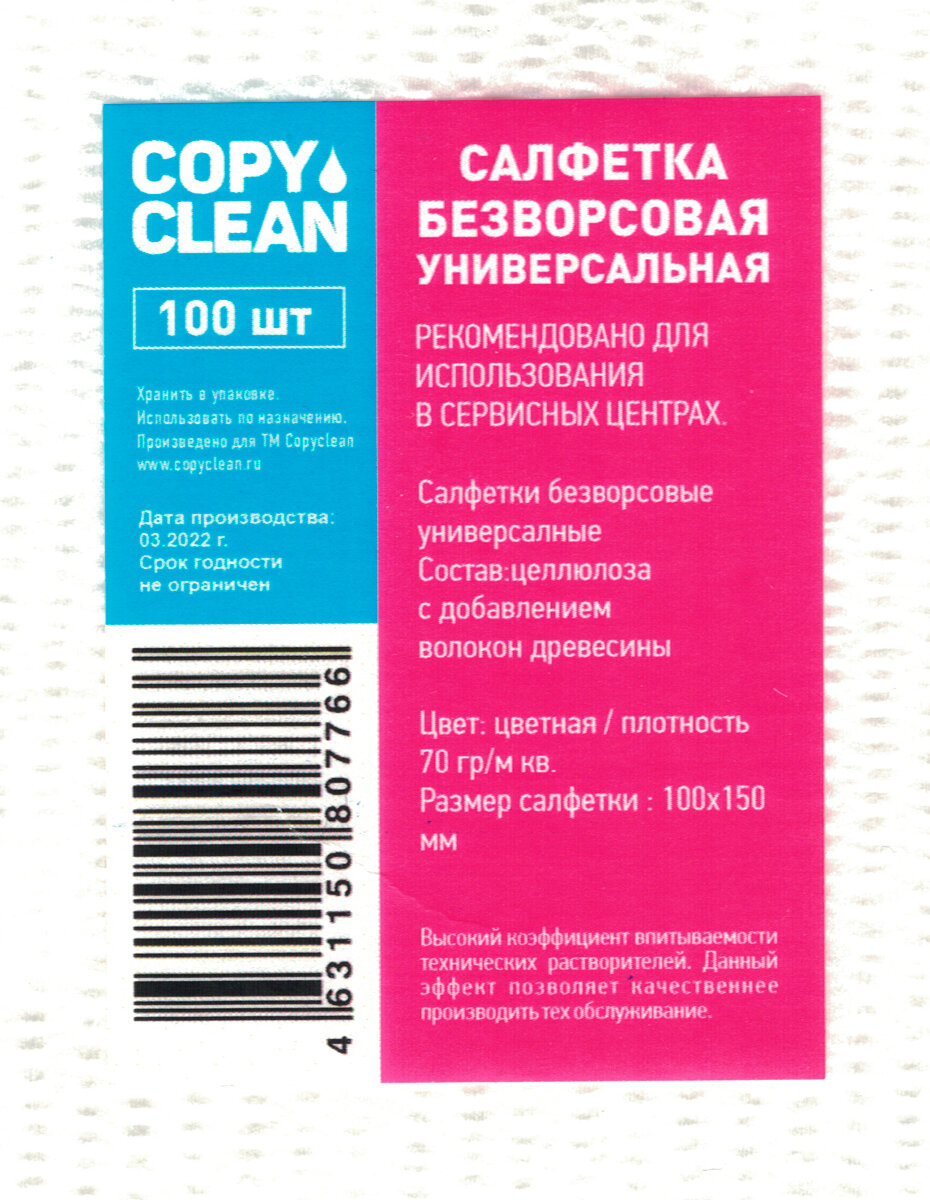 Салфетки CopyClean универсальные безворсовые для оптики (10х15см), (100шт) сухие информация: