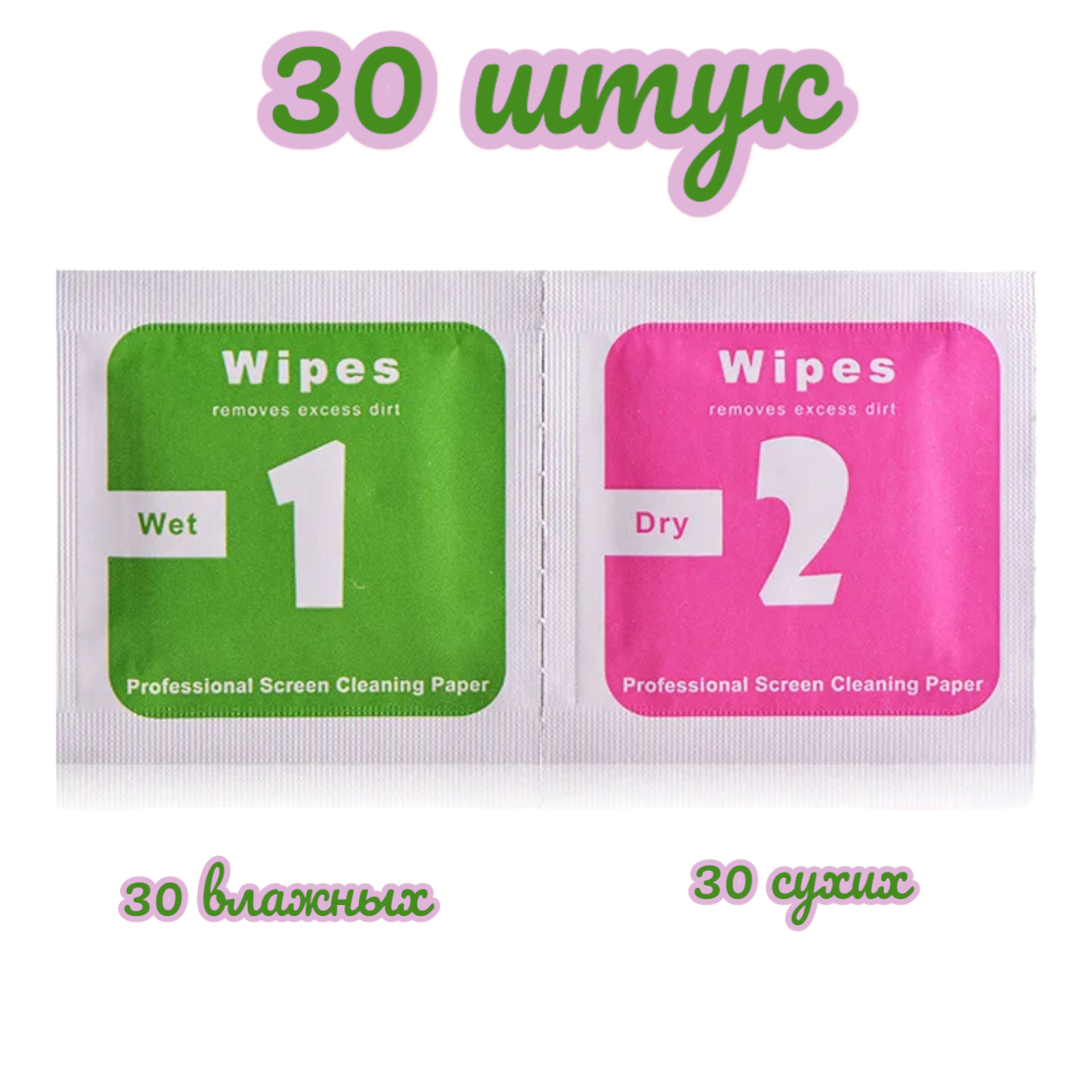 Салфетки для экрана дисплеев 1 и 2 (влажная + сухая) 30штук информация: