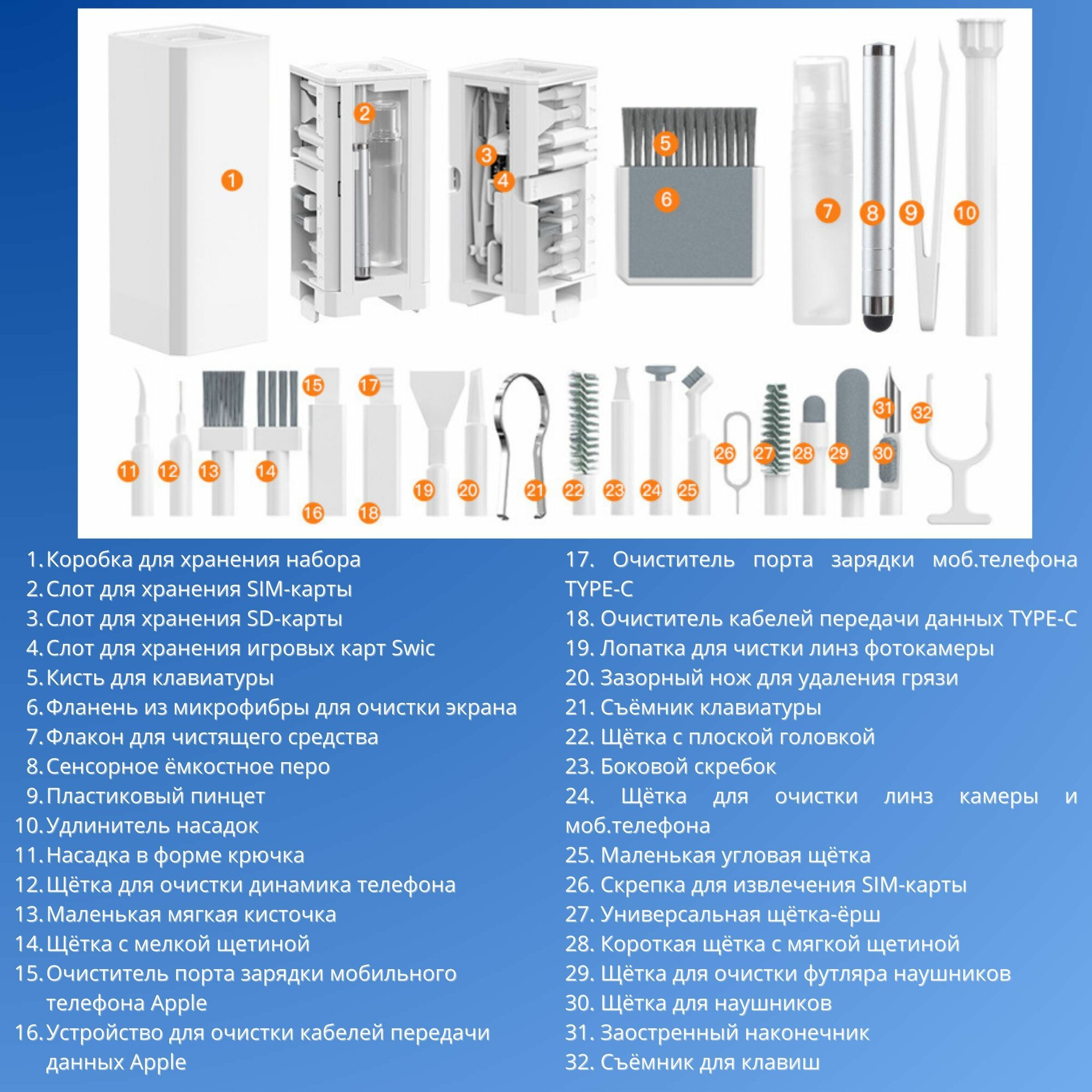 Набор для чистки гаджетов 32 в 1 с щеткой для наушников, телефона и клавиатуры информация: