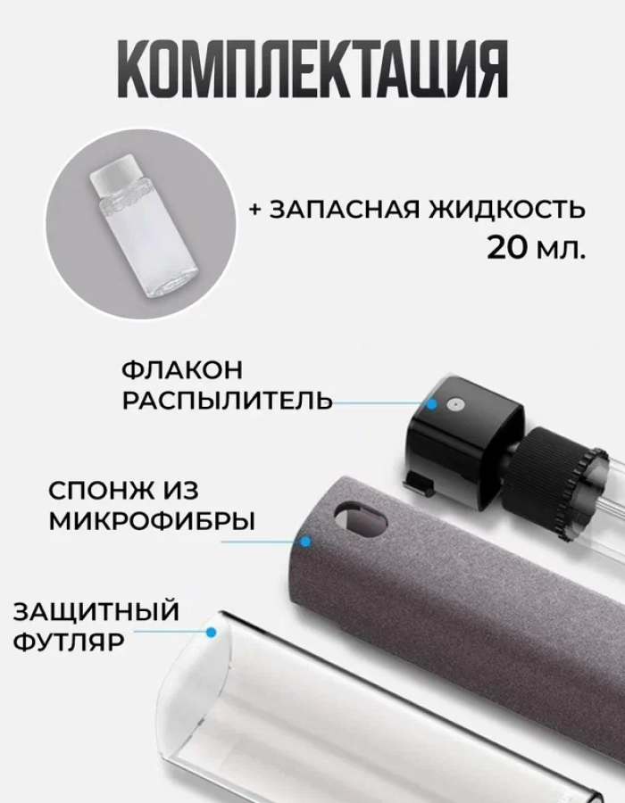 Набор для очистки экранов спрей с микрофиброй и жидкость информация: