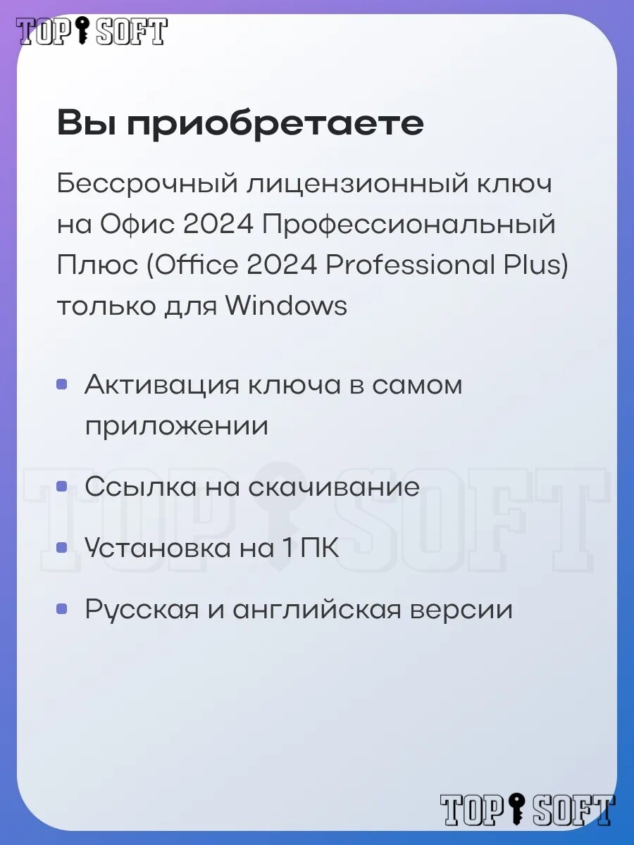 Microsoft Office 2024 Pro Plus (Professional Plus) / Электронный ключ активации / Только для Windows 10|11 Pro или Home / На 1 ПК / Бессрочная лицензионная версия информация: