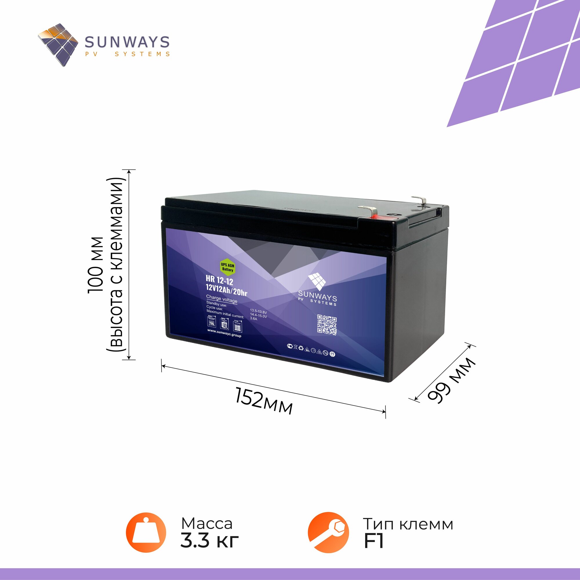 Аккумулятор для ИБП SUNWAYS UPS HR 12В 12Ач (12V 12Ah), Аккумулятор для ИБП, 1 шт информация: