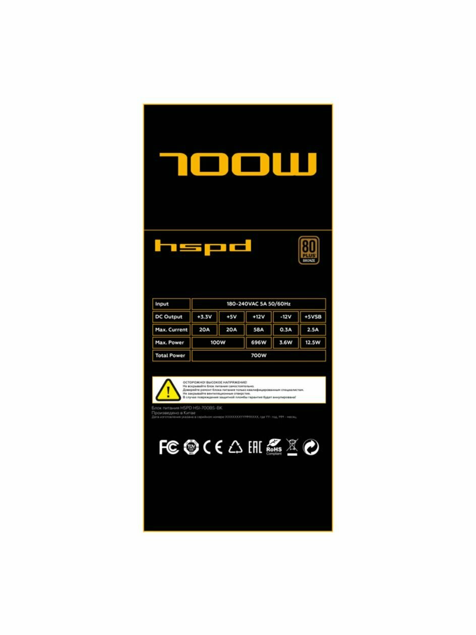 Блок питания для ПК HSPD 700W 80+ Bronze (HSI-700BS-BK) информация: