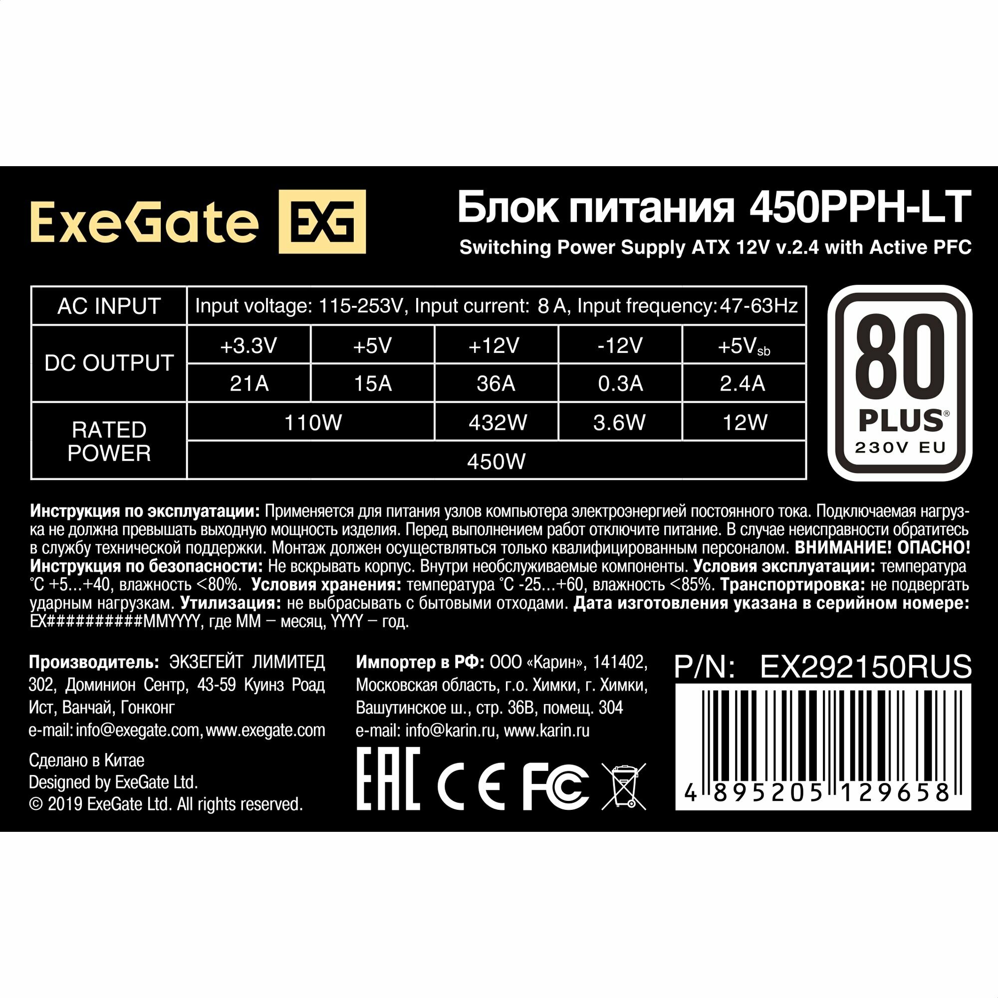 Блок питания 450W ExeGate 80 PLUS® 450PPH-LT (ATX, APFC, КПД 82% (80 PLUS), 12cm fan, 24pin, (4+4)pin, PCI-E, 3xSATA, 3xIDE, Color Box, black) EX292150RUS информация: