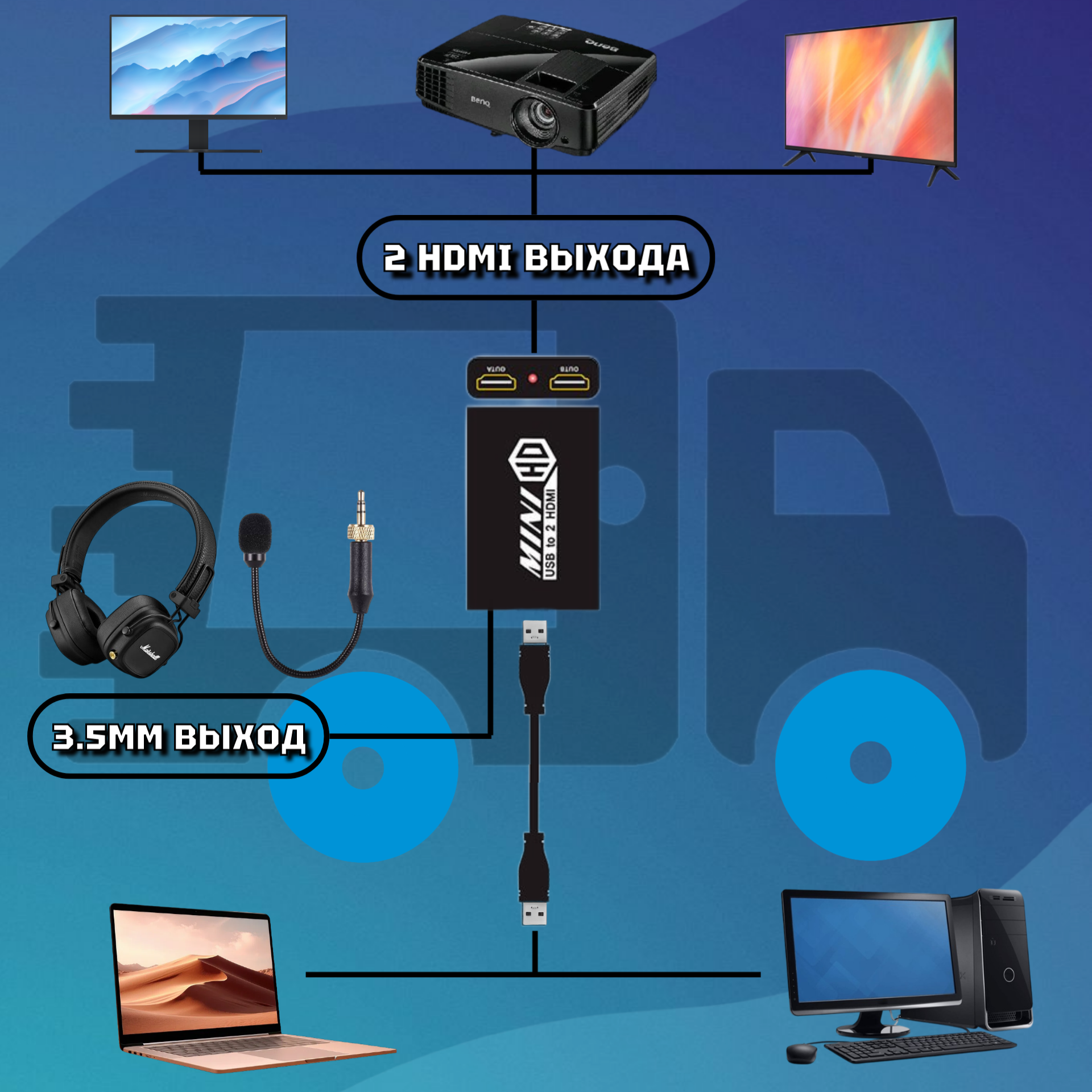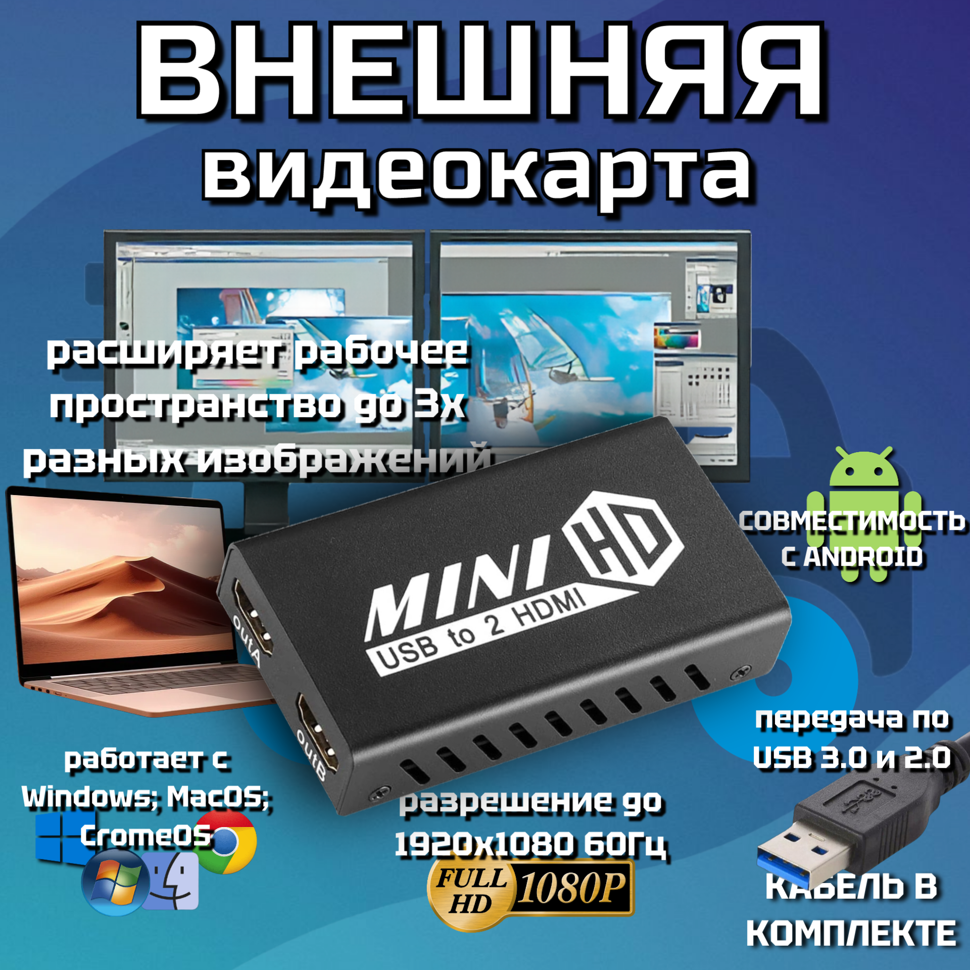 Внешняя USB видеокарта 1080p 60Hz на два монитора HDMI расширение рабочего стола + дублирование экрана для смартфона информация: