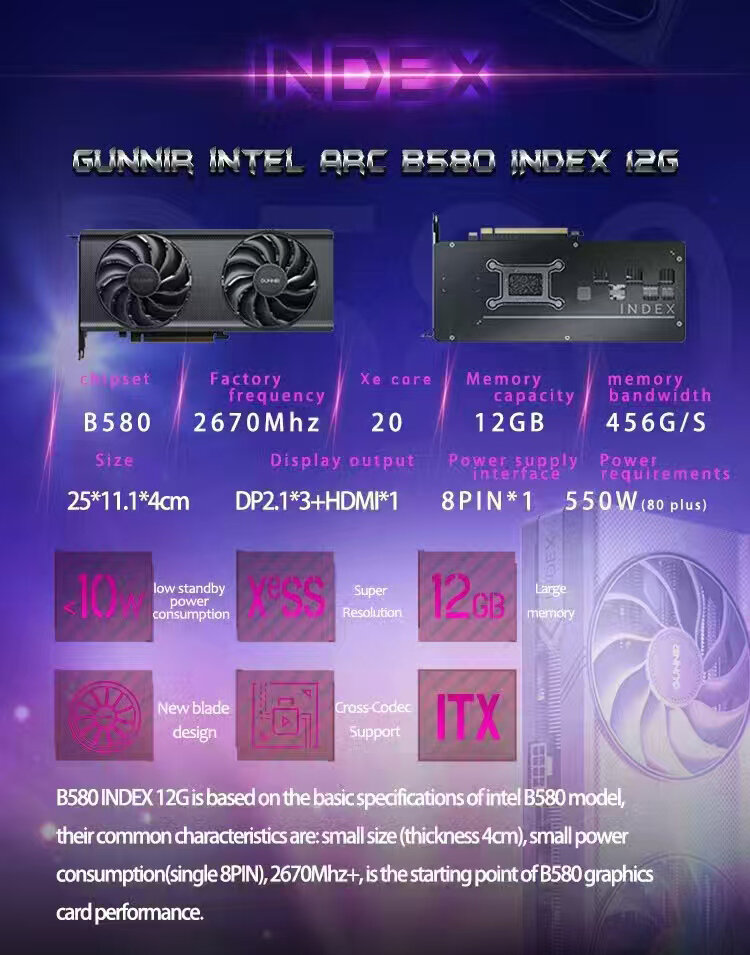 Отзывы на Видеокарта GUNNIR Intel Arc B580 Index 12GB 2670Mhz,12GB 192-bit GDDR6, PCIE4.0, 1*HDMI2.1,3*DP2.1, TBP 190W, Black