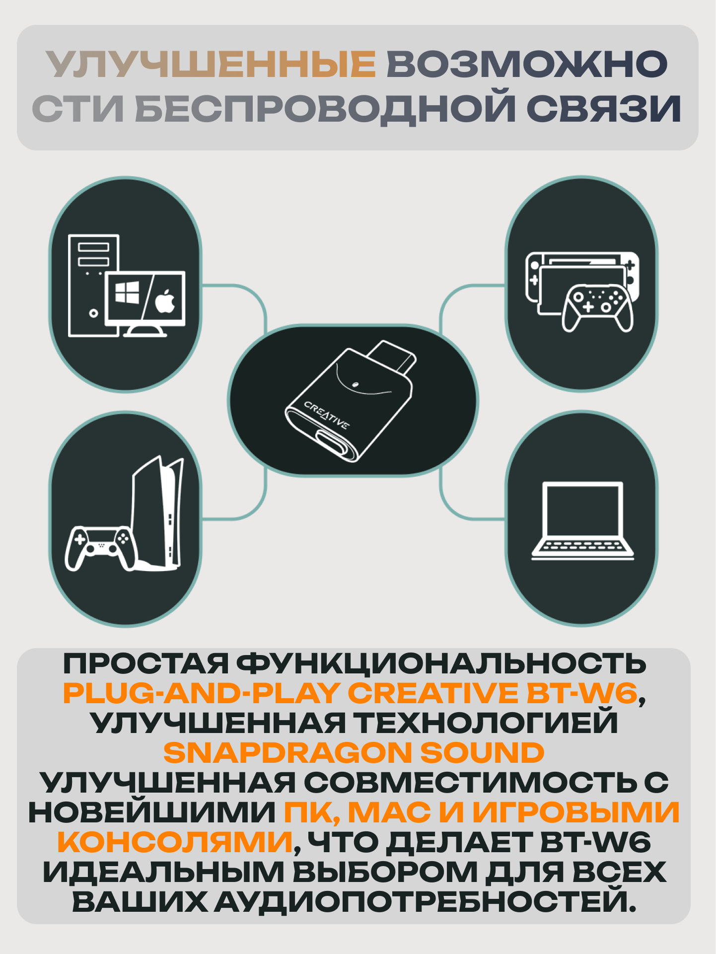 10 цен на Bluetooth-адаптер Creative "BT-W6", поддержка aptX, 24 бита, 96кГц