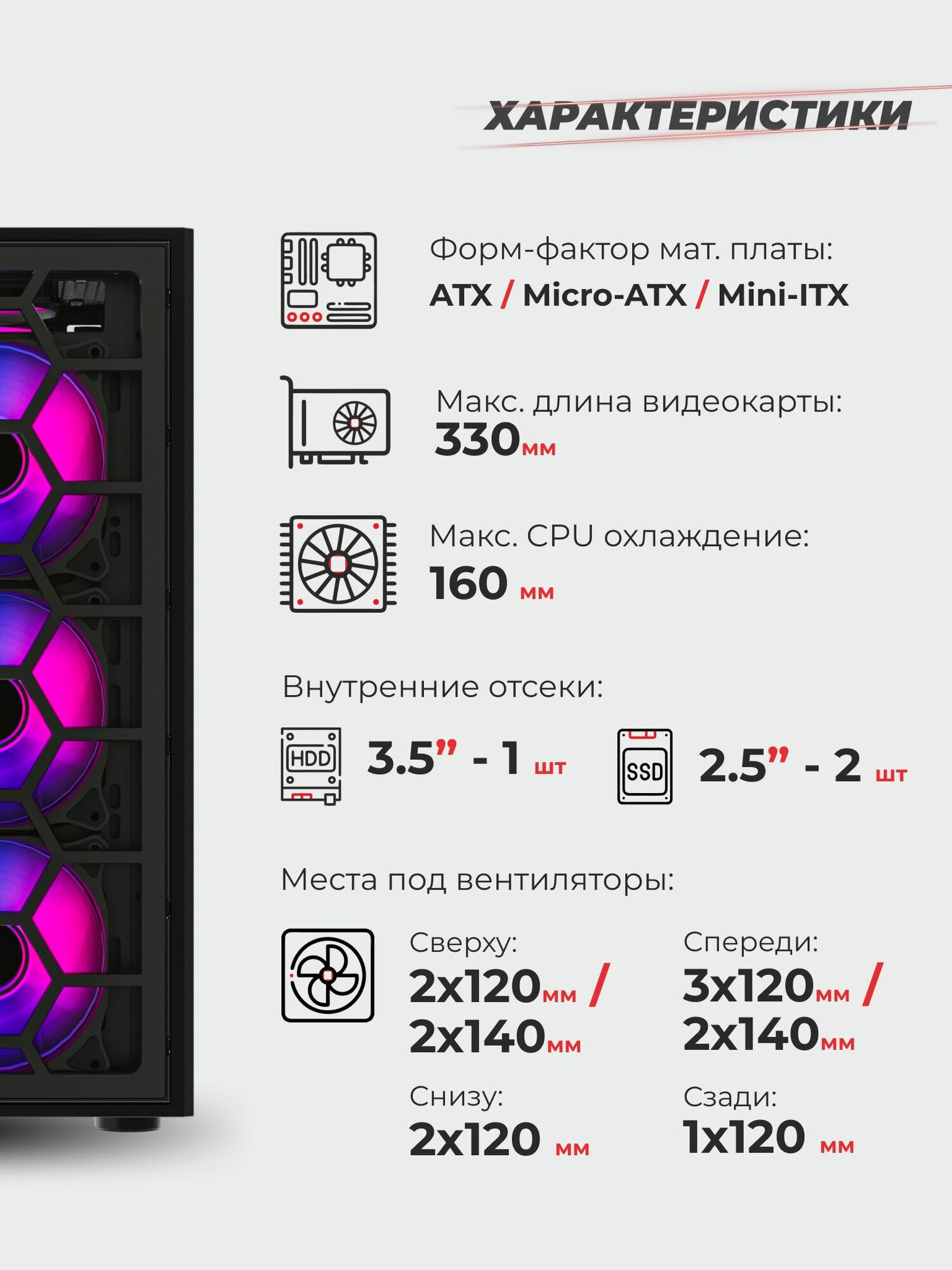 Корпус Predator V1 + 4 ARGB вентилятора + закаленное стекло, ATX, Micro-ATX, Mini-ITX информация: