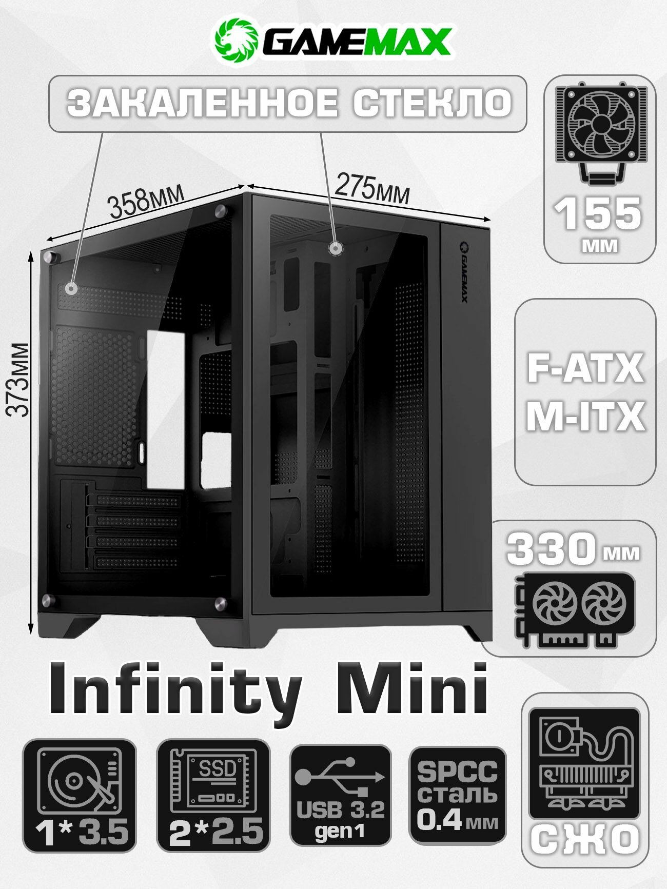 Корпус для ПК GameMax Infinity Mini Black кубик (Черный Mini-Tower CPU 155мм VGA 330мм Закаленное стекло, 1*USB 3.0, 2*USB 2.0) информация: