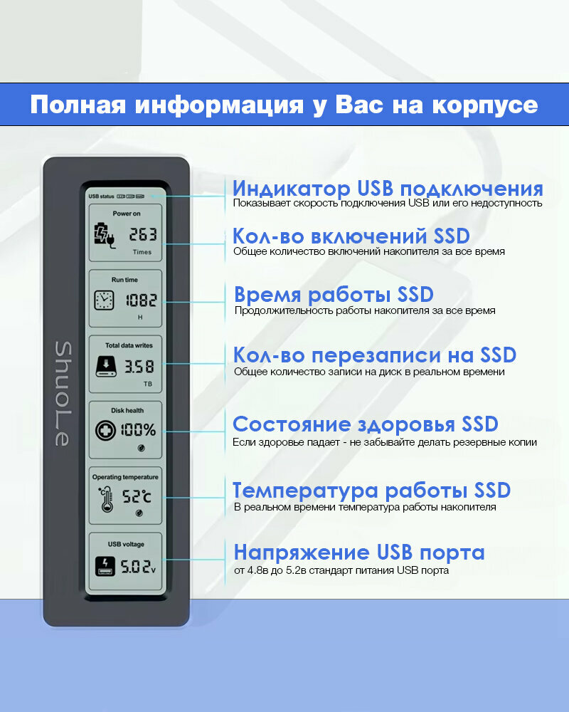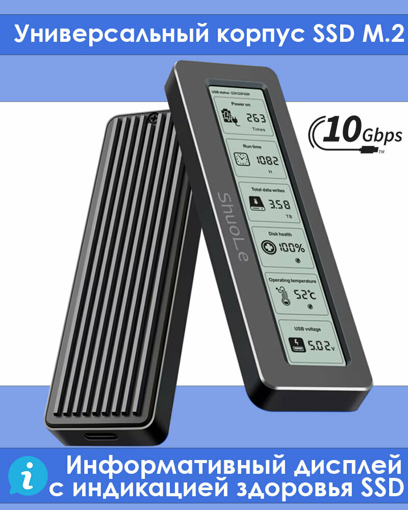 Универсальный переходник (корпус) ShuoLe Health Drive M.2 NVMe, M.2 SATA - USB 3.2 Gen2 с индикационным дисплеем состояния диска информация: