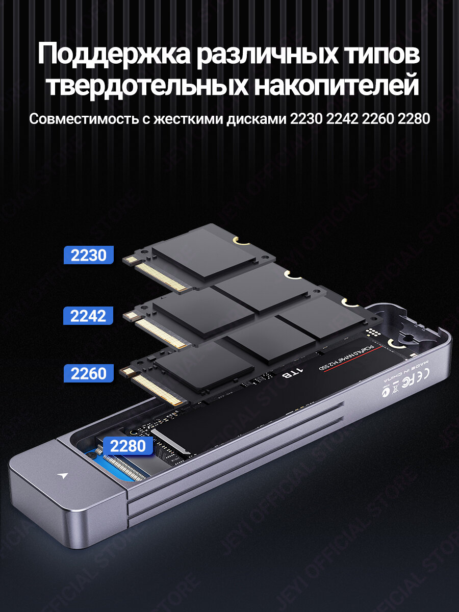 JEYI Прямое M.2 NVMe устройство, USB-C разъем, USB 3.2 , алюминиевый корпус для SSD размеров 2230 и 2242 с магнитным защитным чехлом информация: