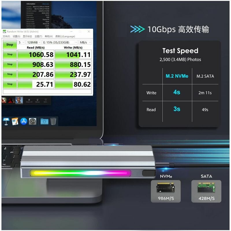 Корпус DM HD1500 USB 3.2 Gen2 M.2 NVMe — двойной протокол 10 Гбит/с, прозрачный корпус с RGB-подсветкой, Plug & Play