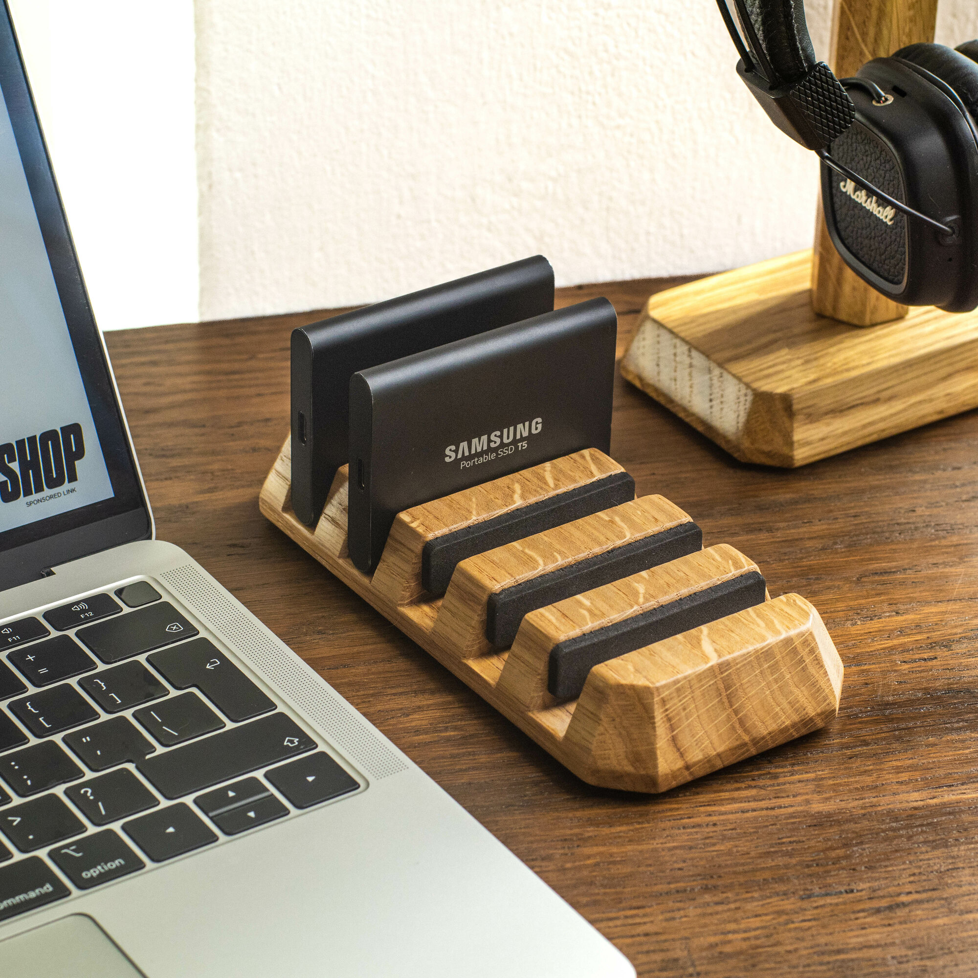 Отзывы на Держатель для 5 внешних накопителей SSD, настольный органайзер для жестких дисков, бокс на рабочем столе, подставка из дуба, Слоты 12 мм.