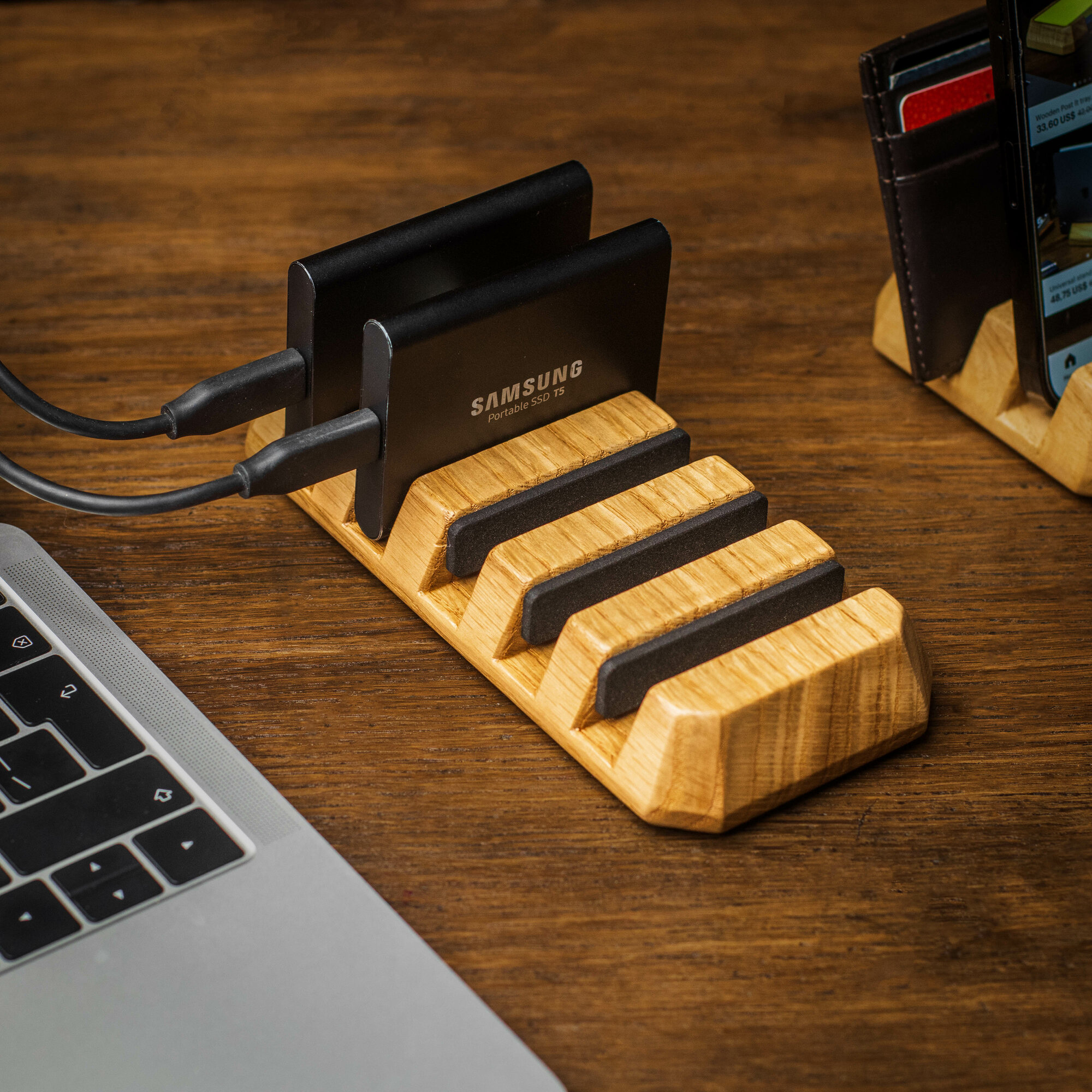 10 цен на Держатель из ясеня для 5 внешних накопителей SSD/HDD, Настольная подставка органайзер для внешних жестких дисков. Слоты 12 мм. Порядок на рабочем столе.
