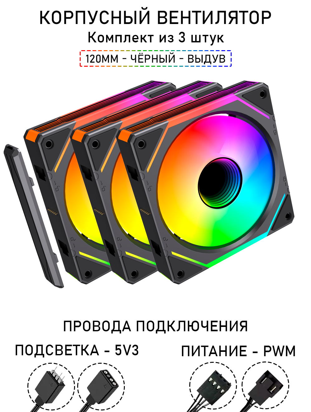 10 цен на Модульный вентилятор - 5PRO Inline - 120мм, A-RGB, PWM+5v3, Комплект из 3 штук, чёрный, на выдув из корпуса