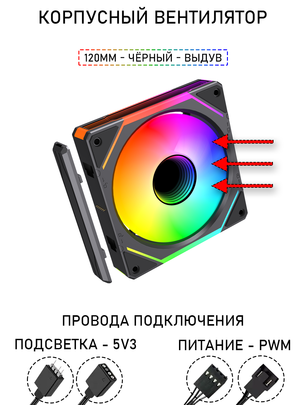 Модульный вентилятор - 5PRO Inline - 120мм, A-RGB, PWM+5v3, Комплект, чёрный, на выдув из корпуса информация: