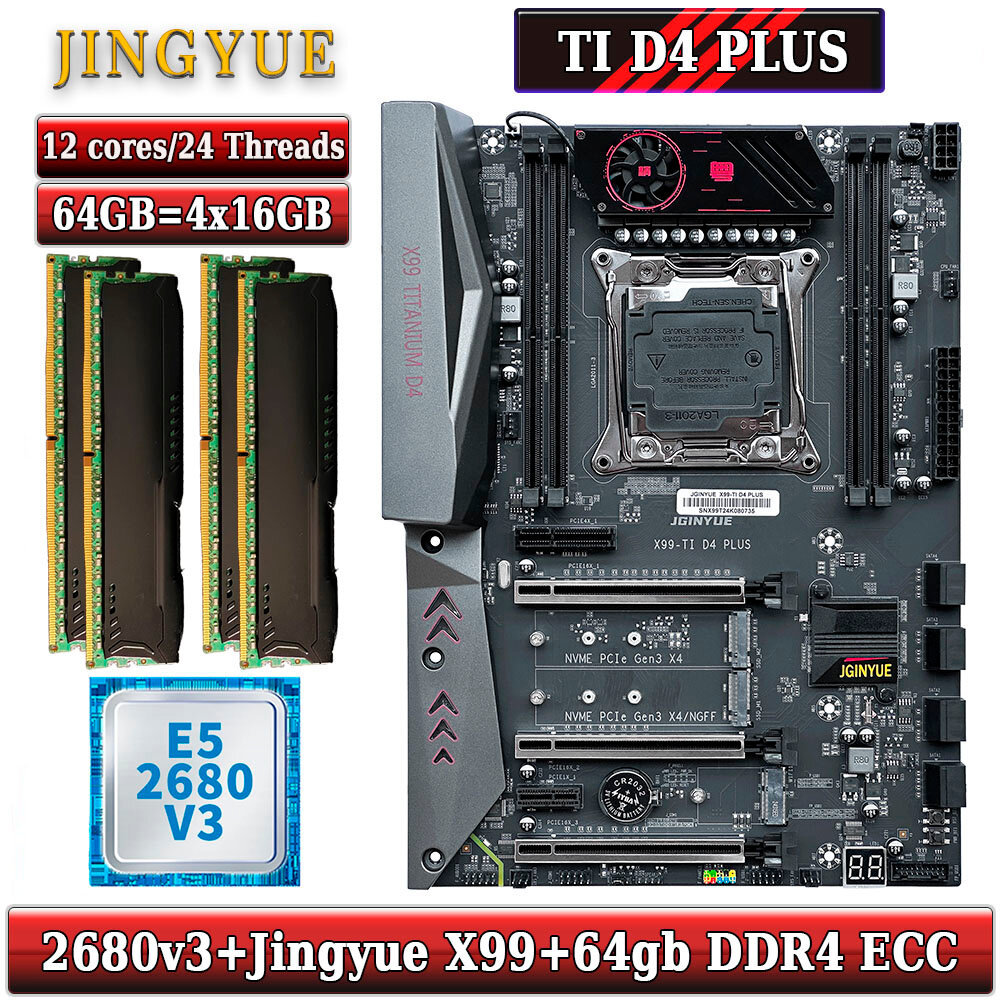 10 цен на Комплект материнская плата Jingyue X99 Titanium D4 + Xeon 2680V3 + 64GB DDR4 ECC 4x16GB Black