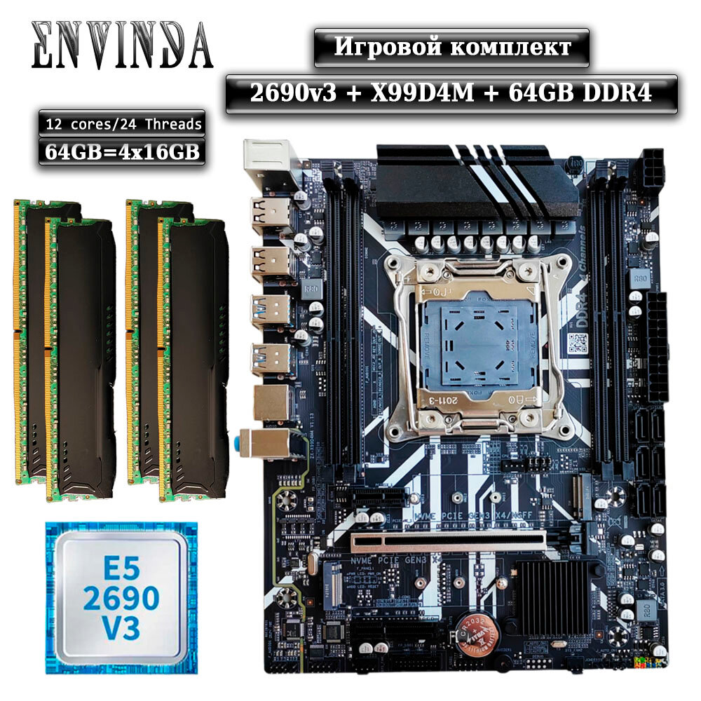 10 цен на Комплект материнская плата Envinda X99 + Xeon 2690V3 + 64GB DDR4 ECC 4x16GB Black