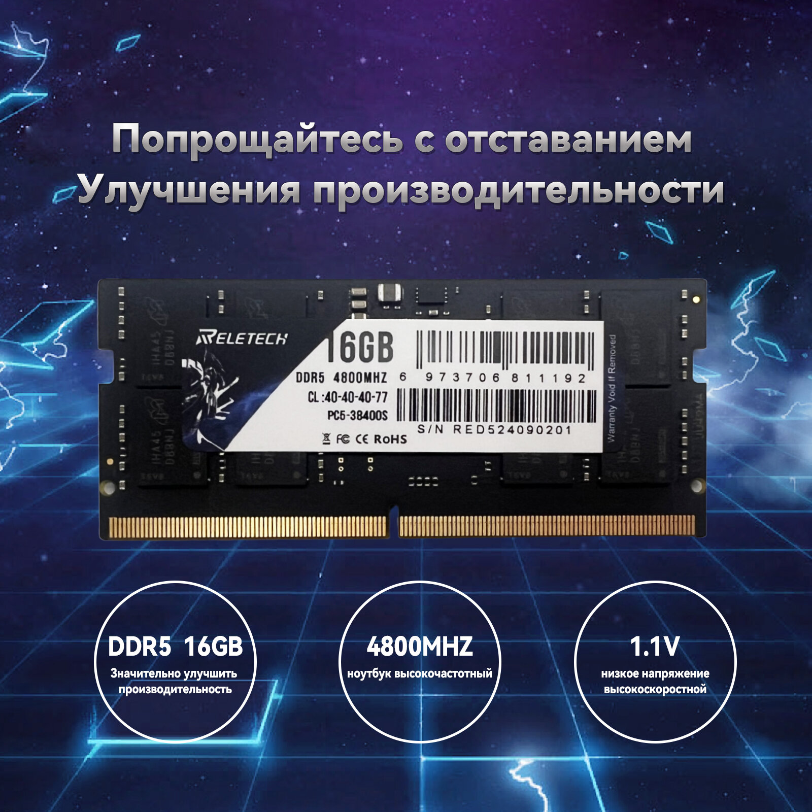 Оперативная память DDR5 16 ГБ 4800MHz CL40 PC5-38400S 1.1V SO-DIMM Для ноутбука, Высокопроизводительная оперативная память Reletech информация: