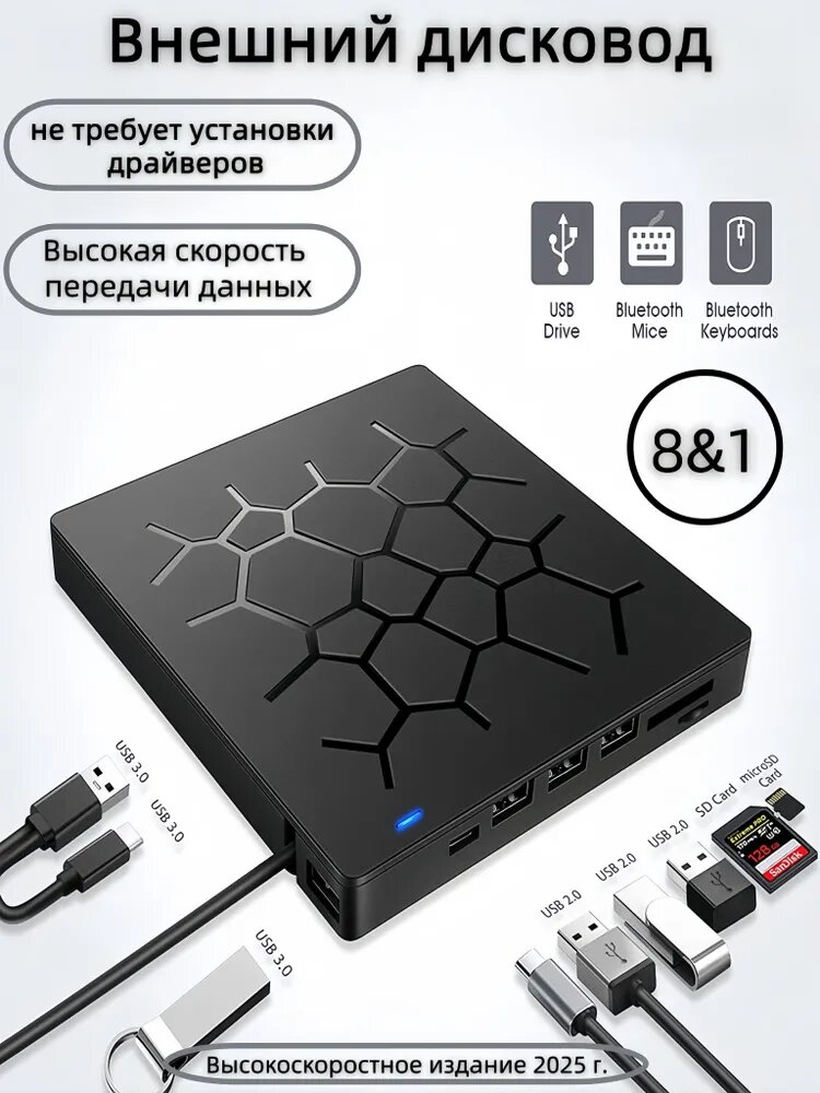 Отзывы на Внешний DVD-привод, для ноутбука, USB 3.0, функция подключения 8-в-1, черный