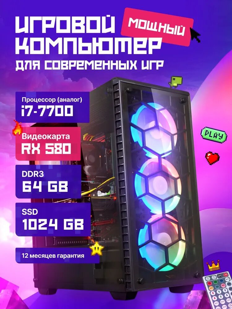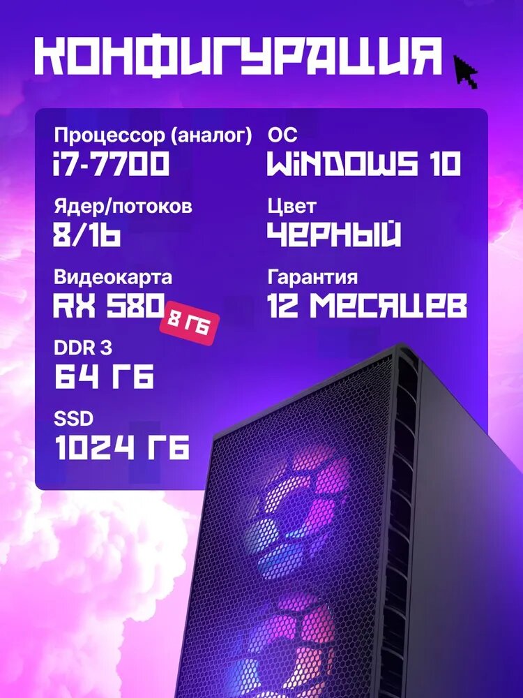 Intel Системный блок Игровой компьютер (Intel Core i7-7700, RAM 64 ГБ, SSD 1024 ГБ, AMD Radeon RX 580 (8 Гб), Windows), черный информация: