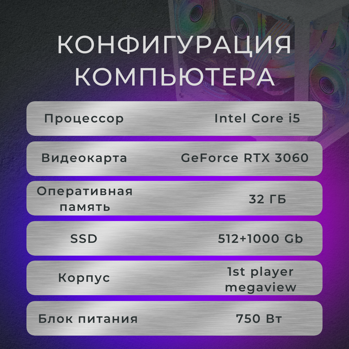Системный блок Intel Core i5-12400F, RAM 32ГБ, SSD NVMe 512ГБ, NVIDIA GeForce RTX 3060 (12 Гб)