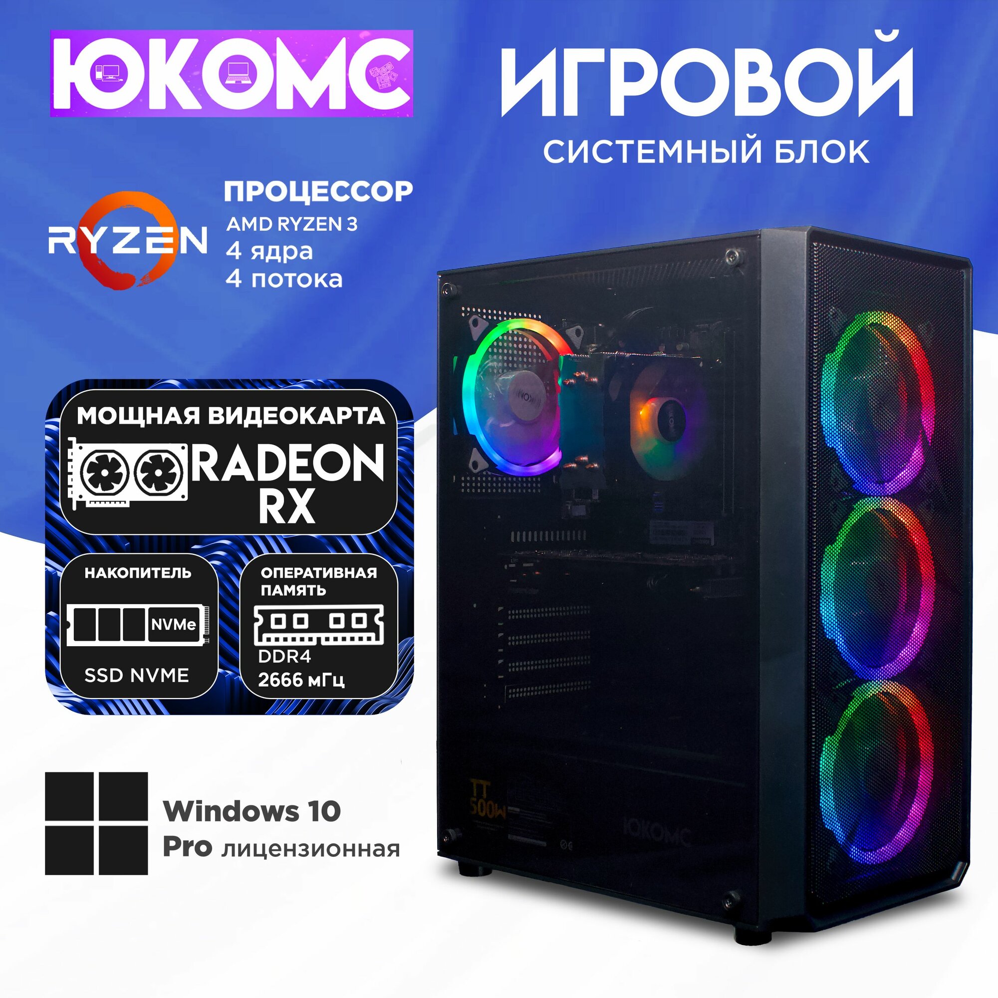 Игровой компьютер юкомс Ryzen 3 1200, RX 560 4GB, SSD 512GB, 16GB DDR4, БП TT450 450W, win 10 pro, Игровой юкомс чёрный 39 200 ₽