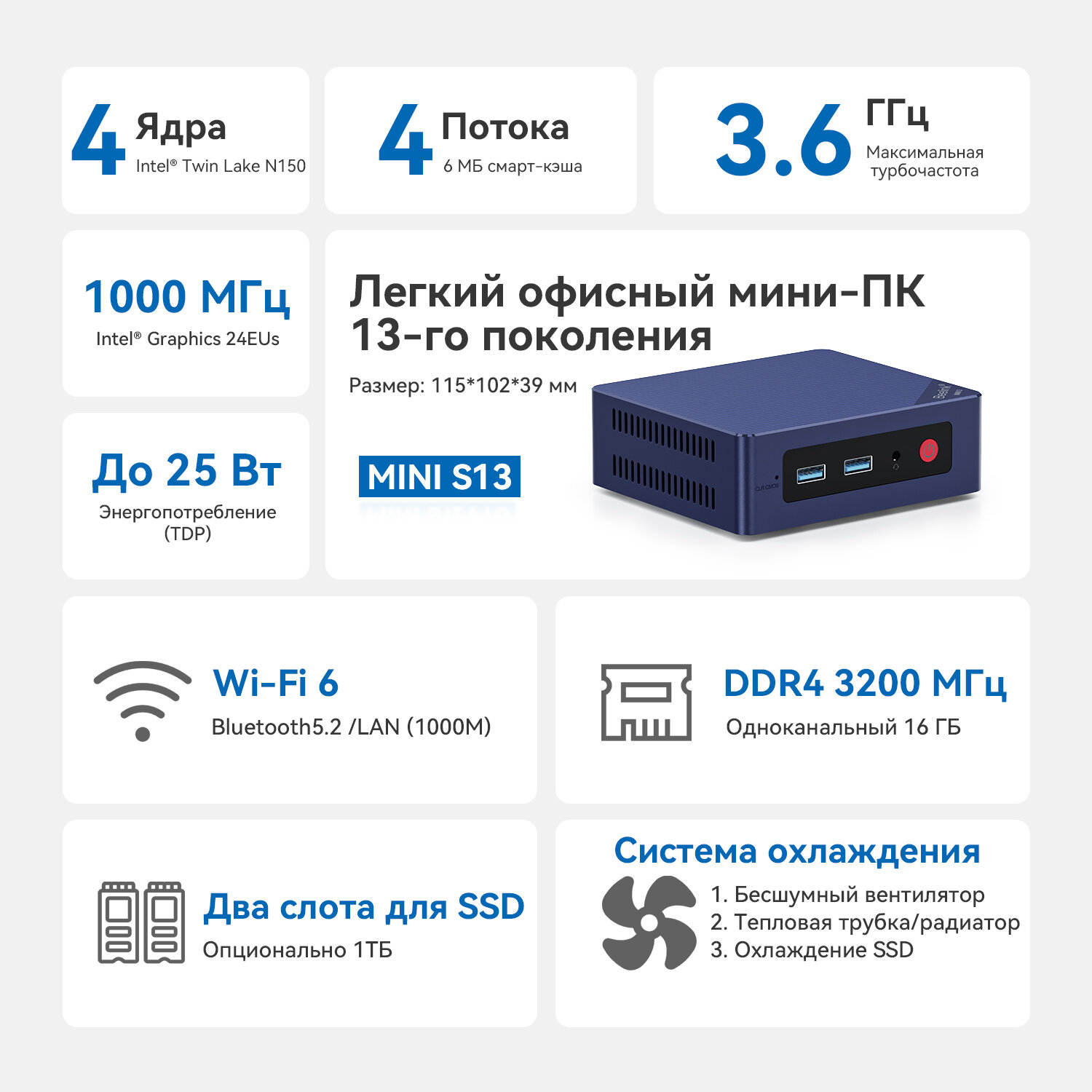 Мини-ПК Beelink S13, Intel N150, ОЗУ 16 ГБ, SSD 1ТБ, Windows 11 Pro, Wi-Fi 6, Bluetooth5,2 информация:
