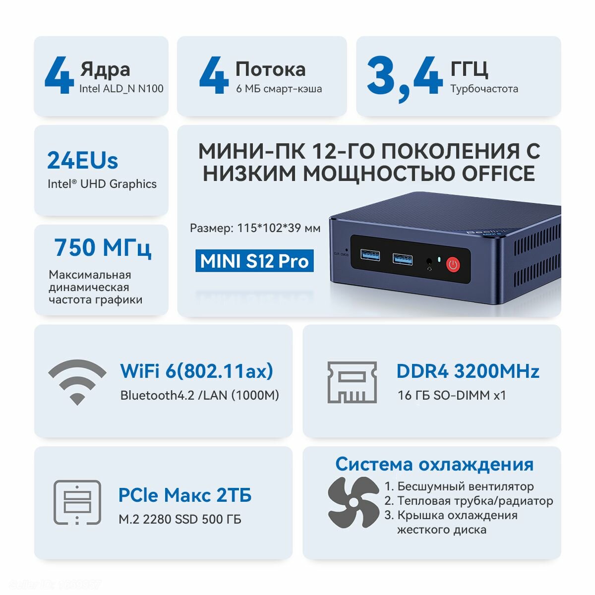 Beelink Мини ПК Mini S12Pro, Alder Lake-N100 3,4 ГГц, ОЗУ 16 ГБ, SSD 500 ГБ, Wi-Fi 6, Bluetooth 5.2, Windows 11 Pro информация: