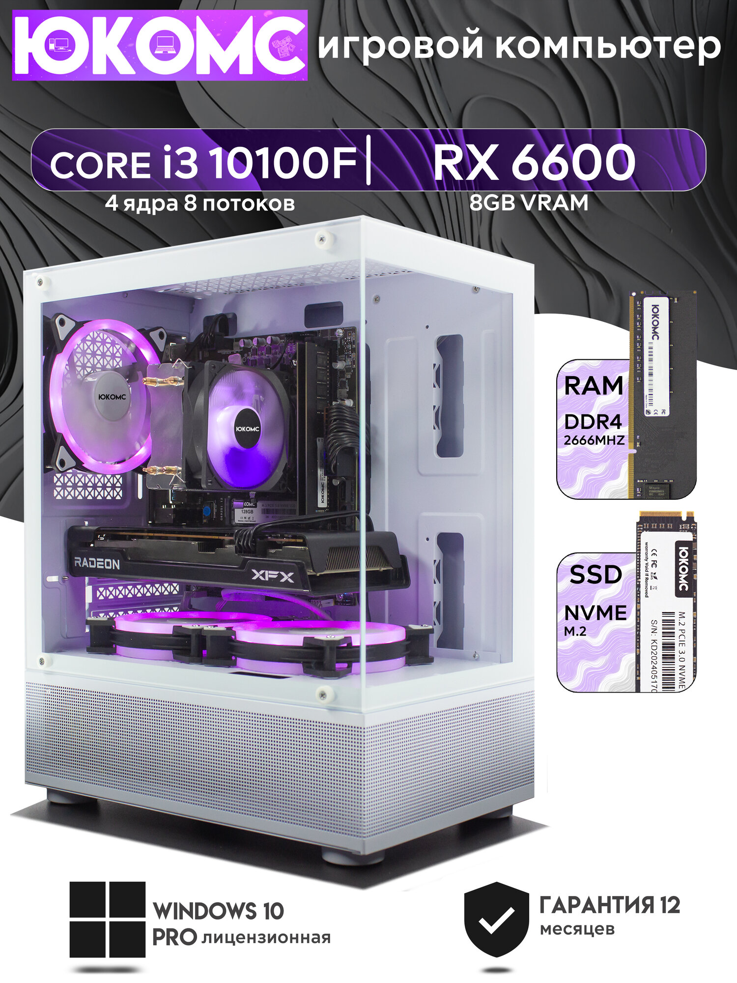 Игровой компьютер юкомс i3 8100, RX 6600 XT 8GB, SSD 512GB, 32GB DDR4, БП TT450 450W, win 10 pro, Игровой юкомс белый 56 000 ₽