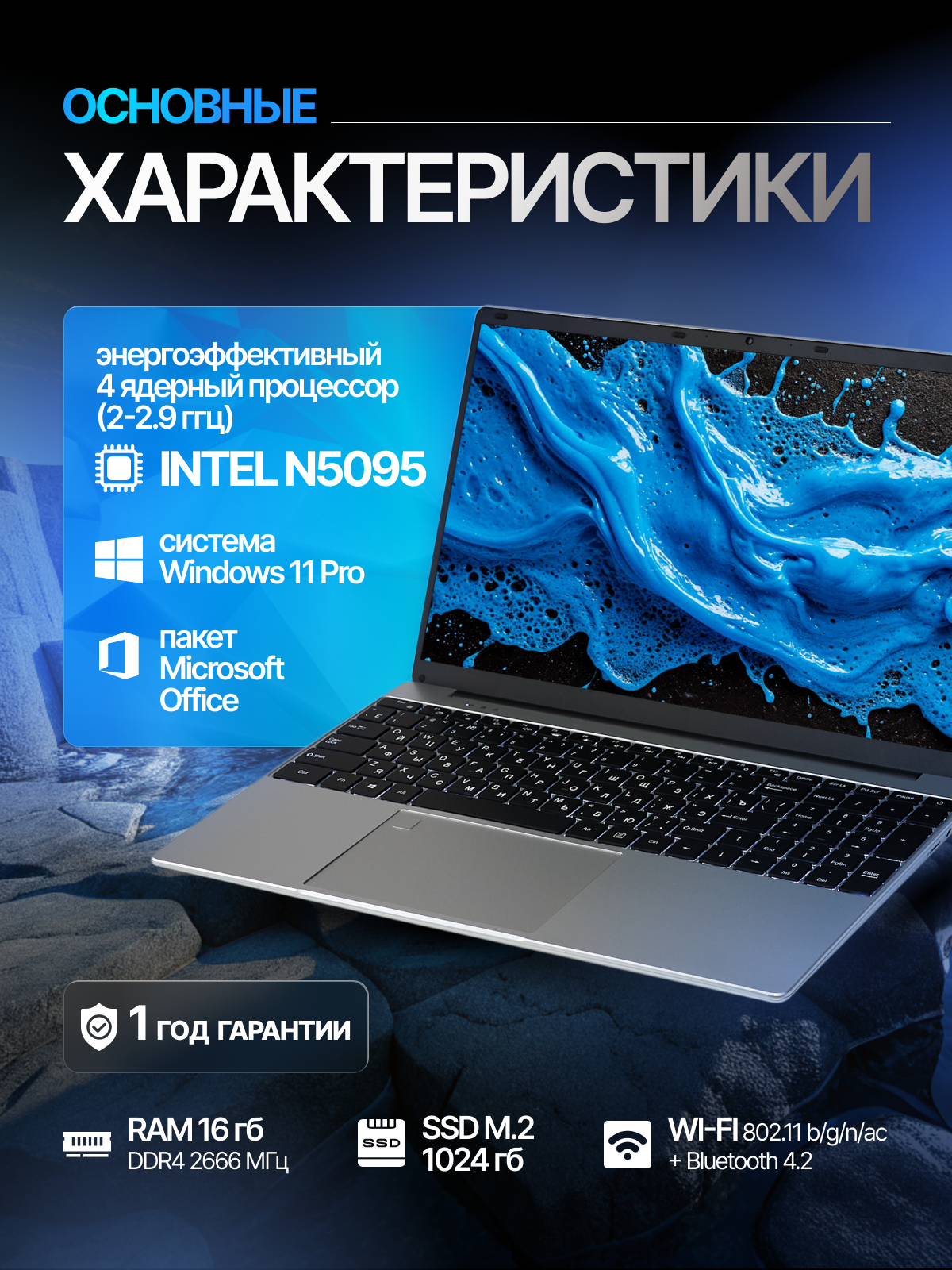 Ноутбук для работы и учебы EXPEcomp NEO S15, Intel N5095 (до 2.9 GHz, 4 ядра), RAM 16 GB, SSD 1024 GB, Windows 11 Pro информация: