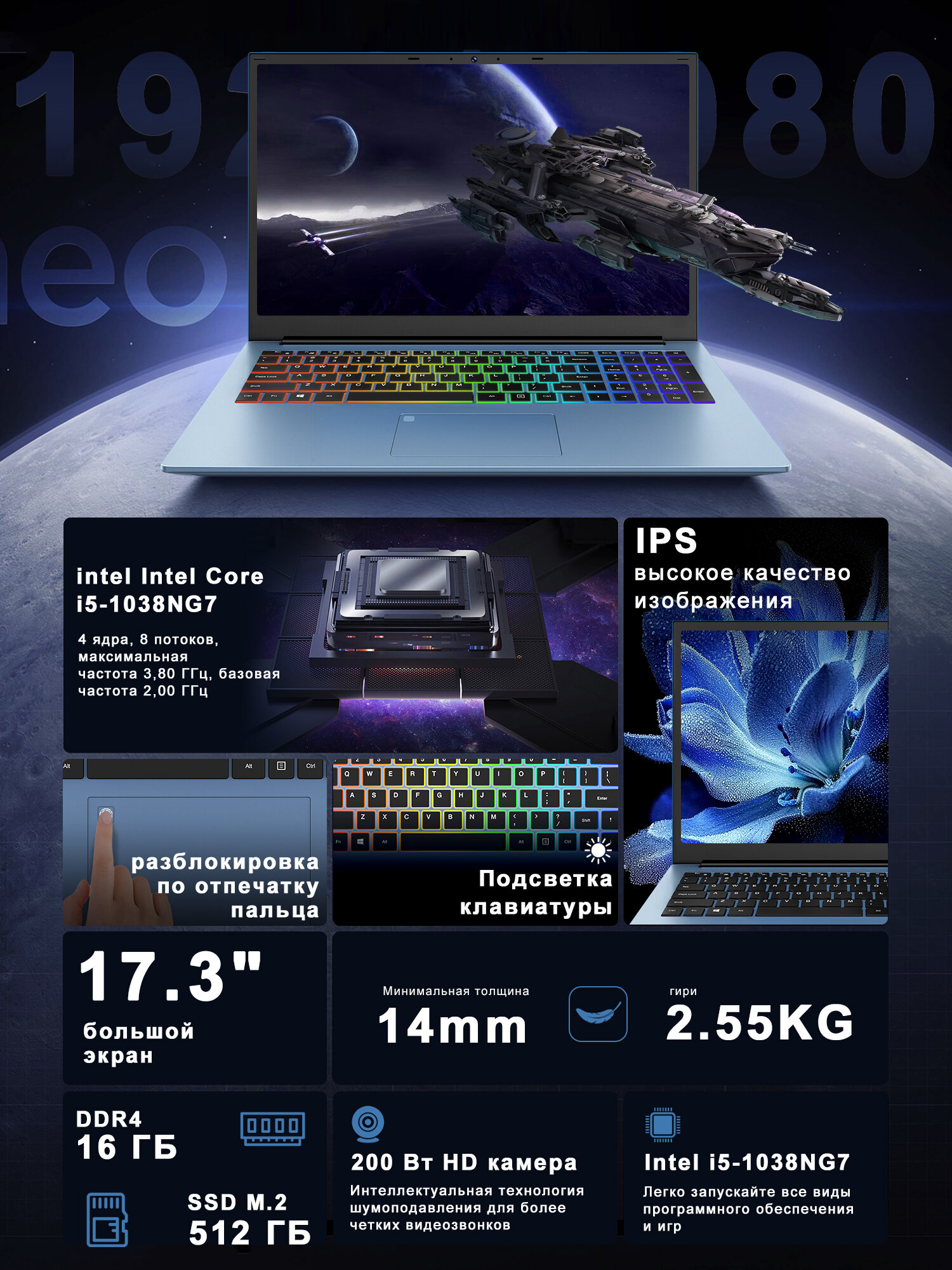 Ноутбук для работы 17.3" IPS Intel Core-i5 RAM 16ГБ DDR4 512ГБ SSD Русская клавиатура Windows 11 pro информация: