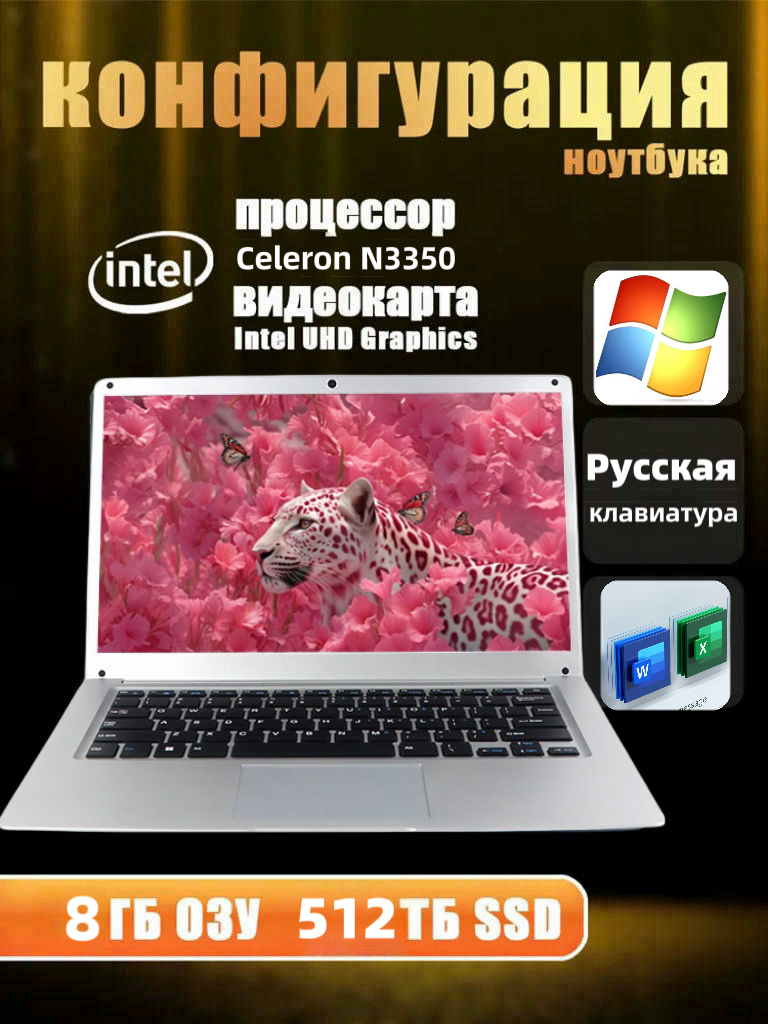 Ноутбук 14 Дюймов", intel celeron N3350, RAM 8ГБ, SSD512 ГБ, Intel UHD Graphics, Windows Pro, Русская раскладка информация:
