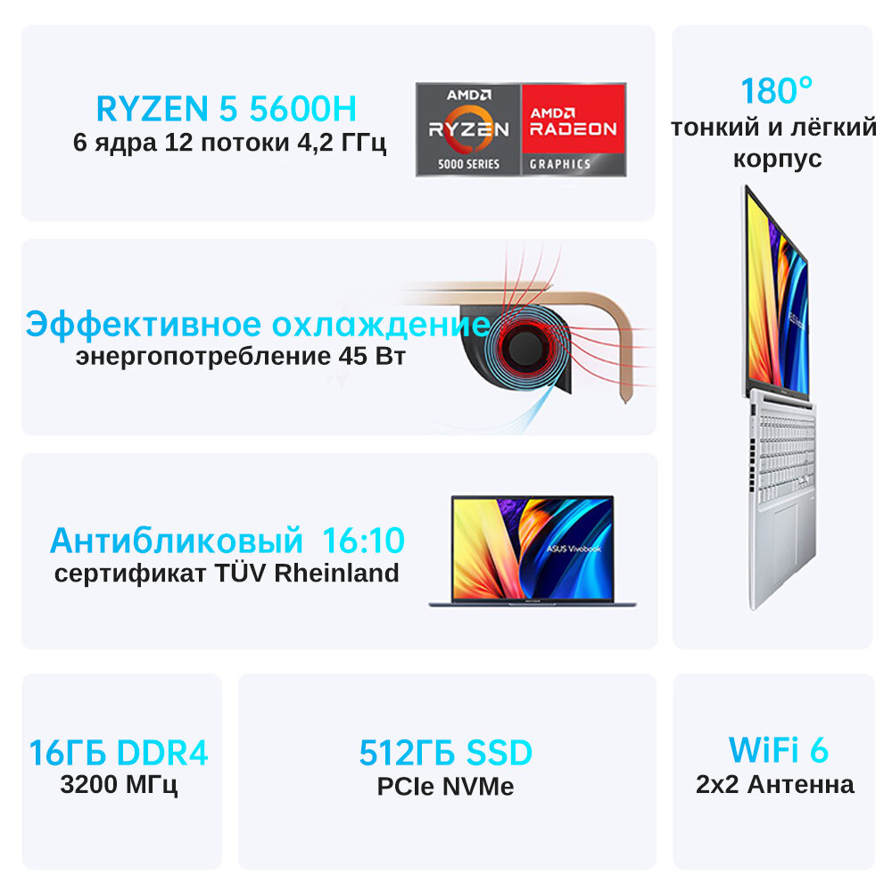 Отзывы на Ноутбук ASUS Vivobook16,16", IPS, Ryzen5 5600H,DDR4 16ГБ,SSD 512ГБ,Windows 11 Pro