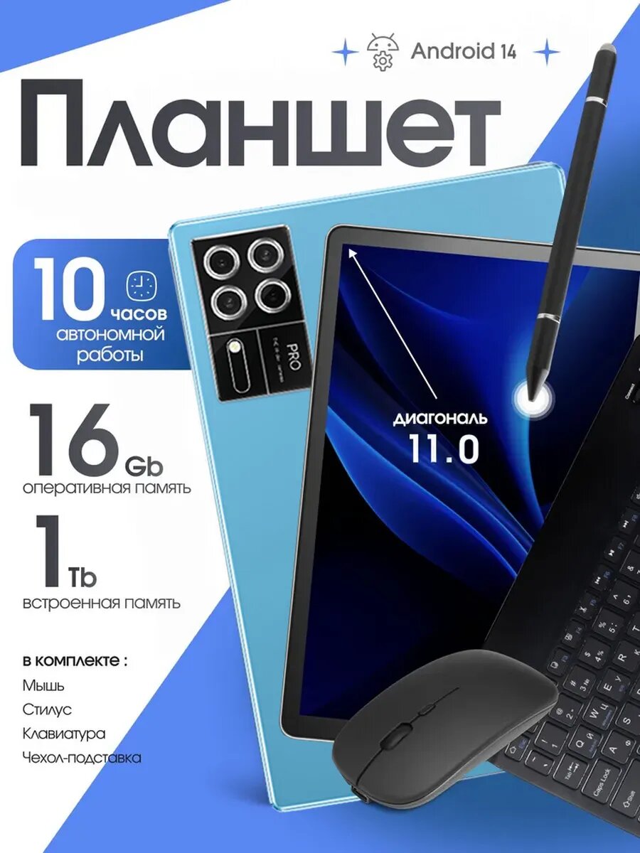 Планшет aндроид с клавиатурой и стилусом, экран 11 дюймов, 1024 Гб, синий информация: