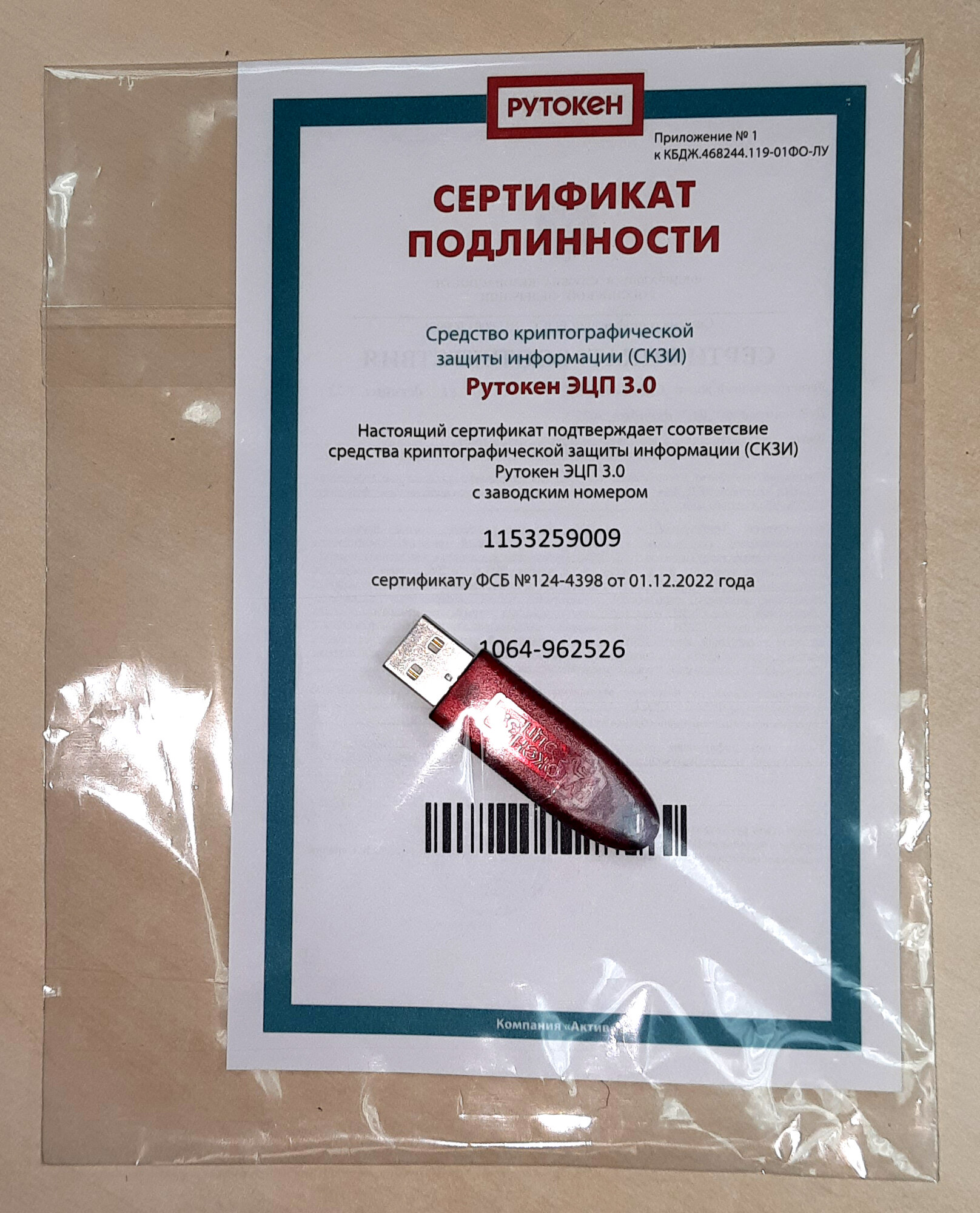 Электронный идентификатор Рутокен ЭЦП 3.0 3220, серт. ФСБ, инд. уп. информация: