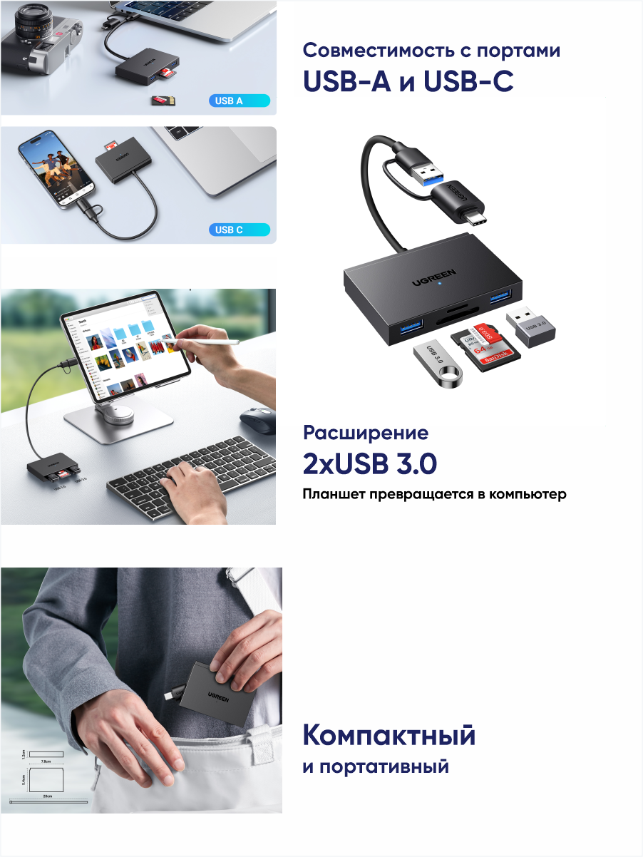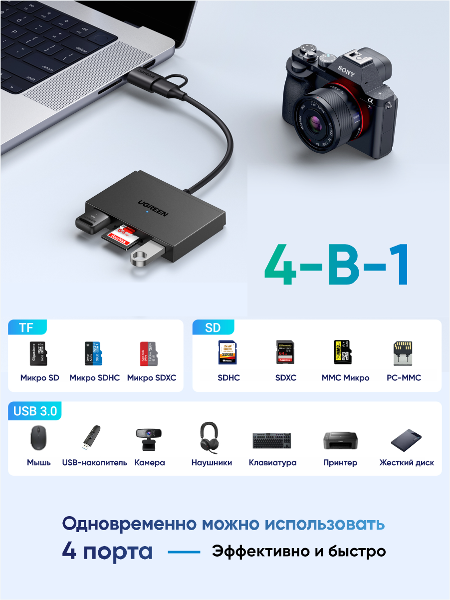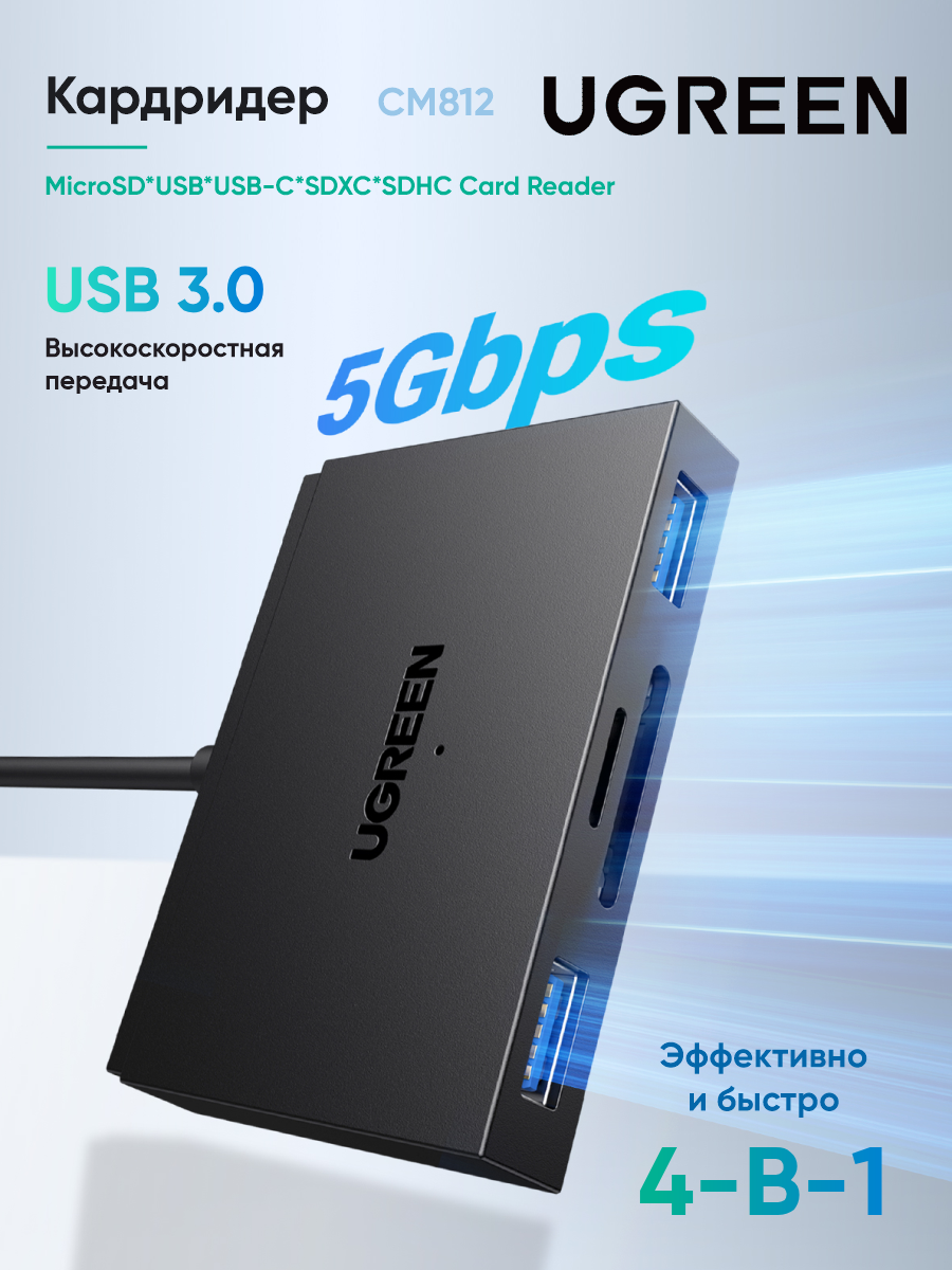 Отзывы на Кардридер UGREEN CM812 (45167) 4-in-1 Card Reader. Цвет: черный