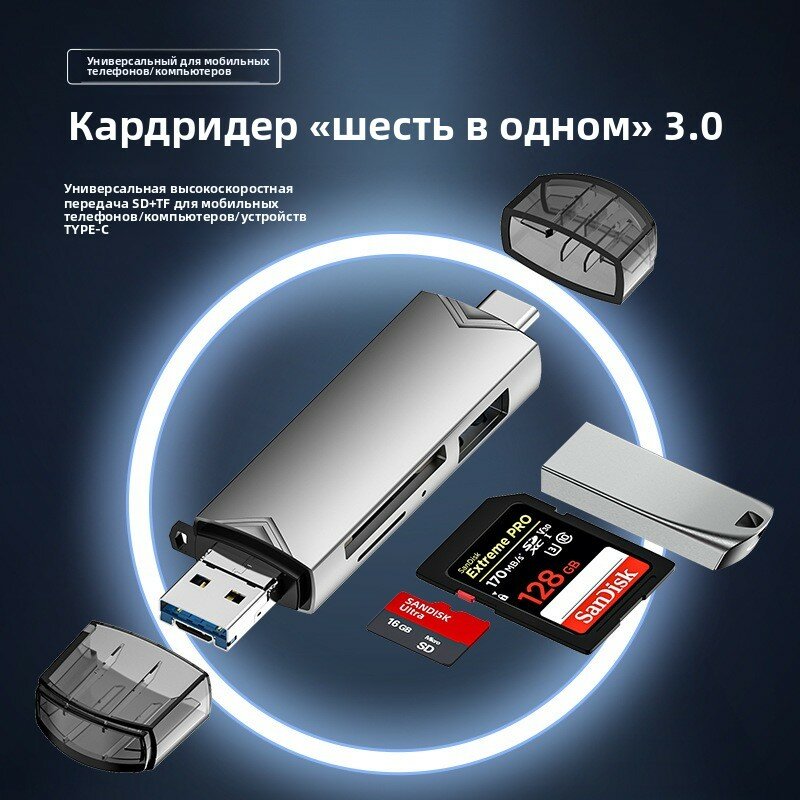 Картридер 6 в 1 USB 3.0 + Type-C, SD/TF/OTG, для телефона, ноутбука, ПК, универсальный кардридер microsd и флешек информация:
