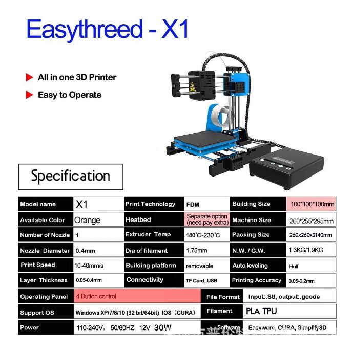 Мини 3D-принтер Easy Thread X1 с областью печати 100x100x100 мм, принтер Tiny Maker информация: