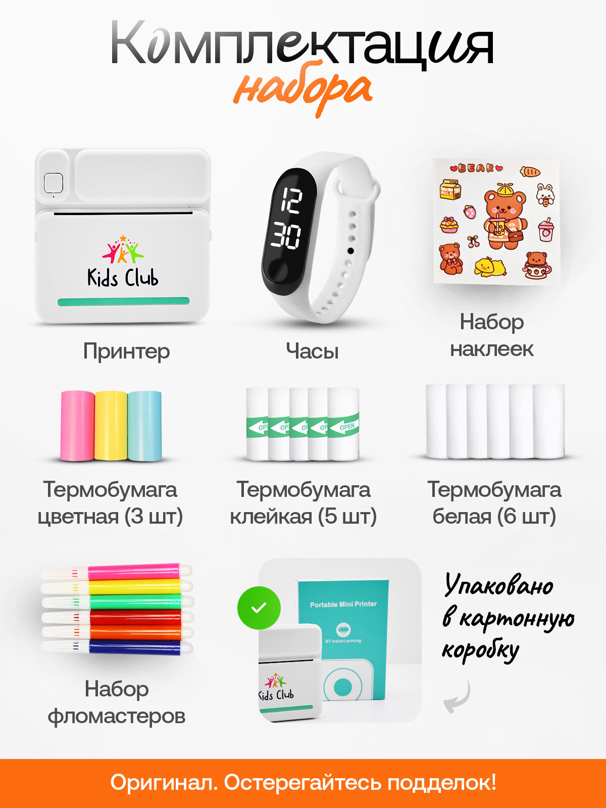 Мини принтер Kids Club портативный с часами не нужно заправлять для наклеек информация: