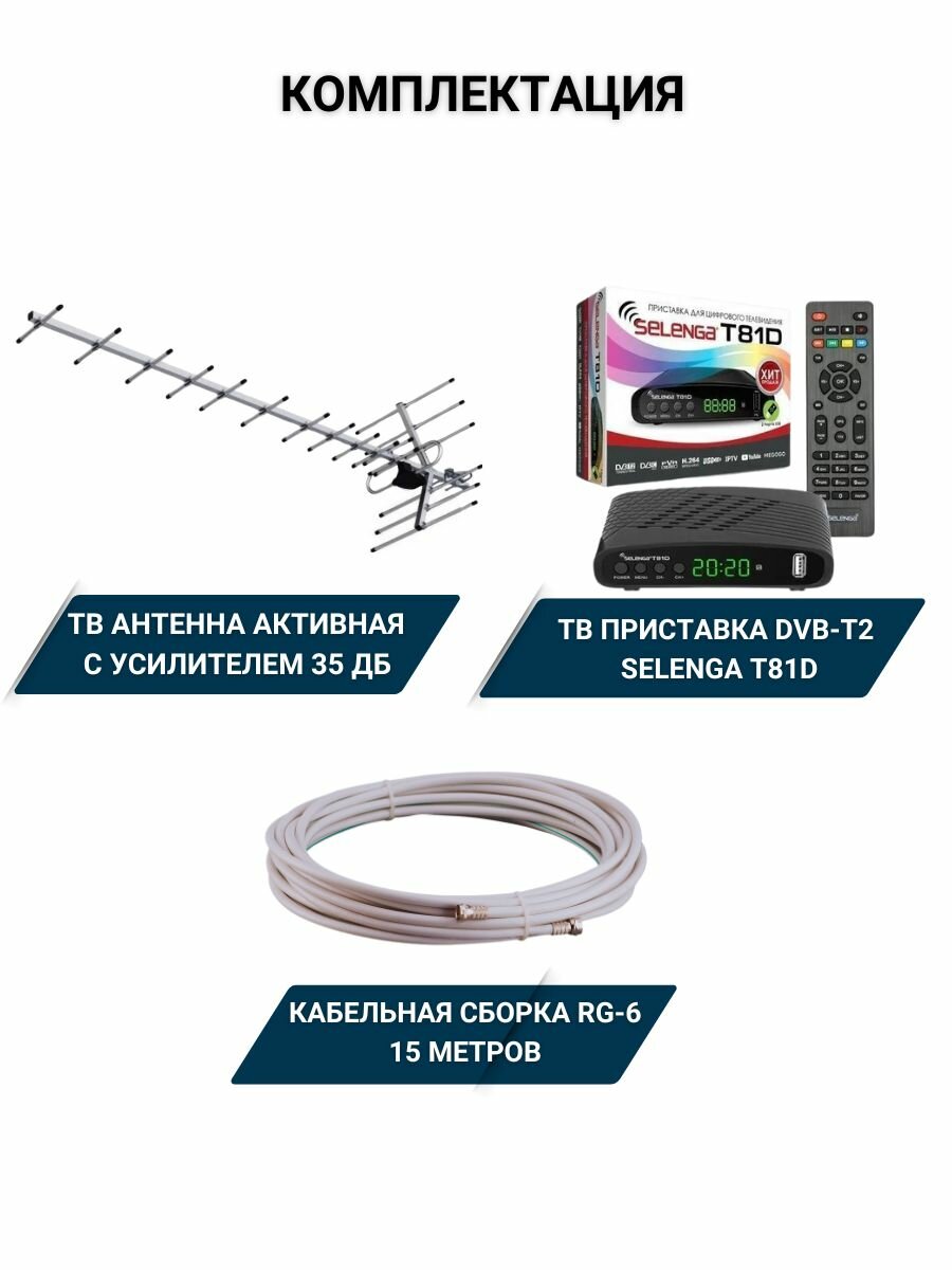 Цифровая ТВ приставка DVB-T2 с уличной активной антенной 35 дБ до 80 км (Кабельная сборка 15м) информация: