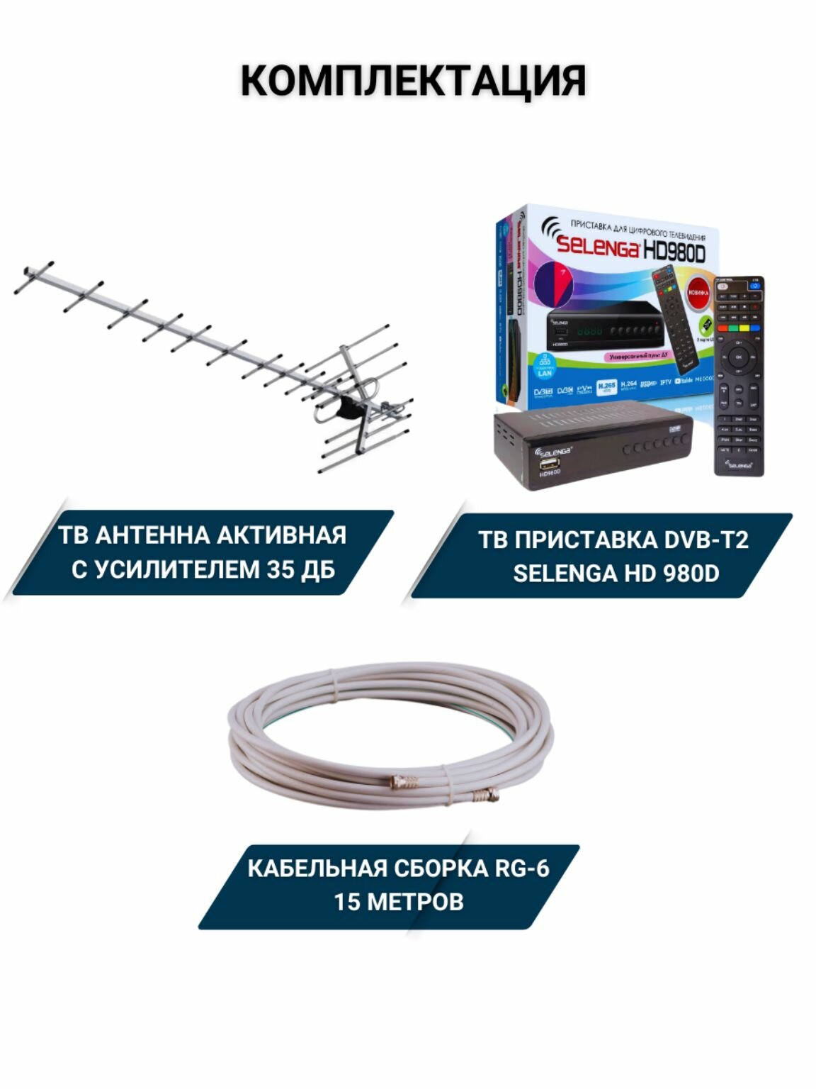 Цифровая ТВ приставка HD 980D DVB-T2 с уличной активной антенной 35 дБ до 80 км (Кабельная сборка 15м) информация: