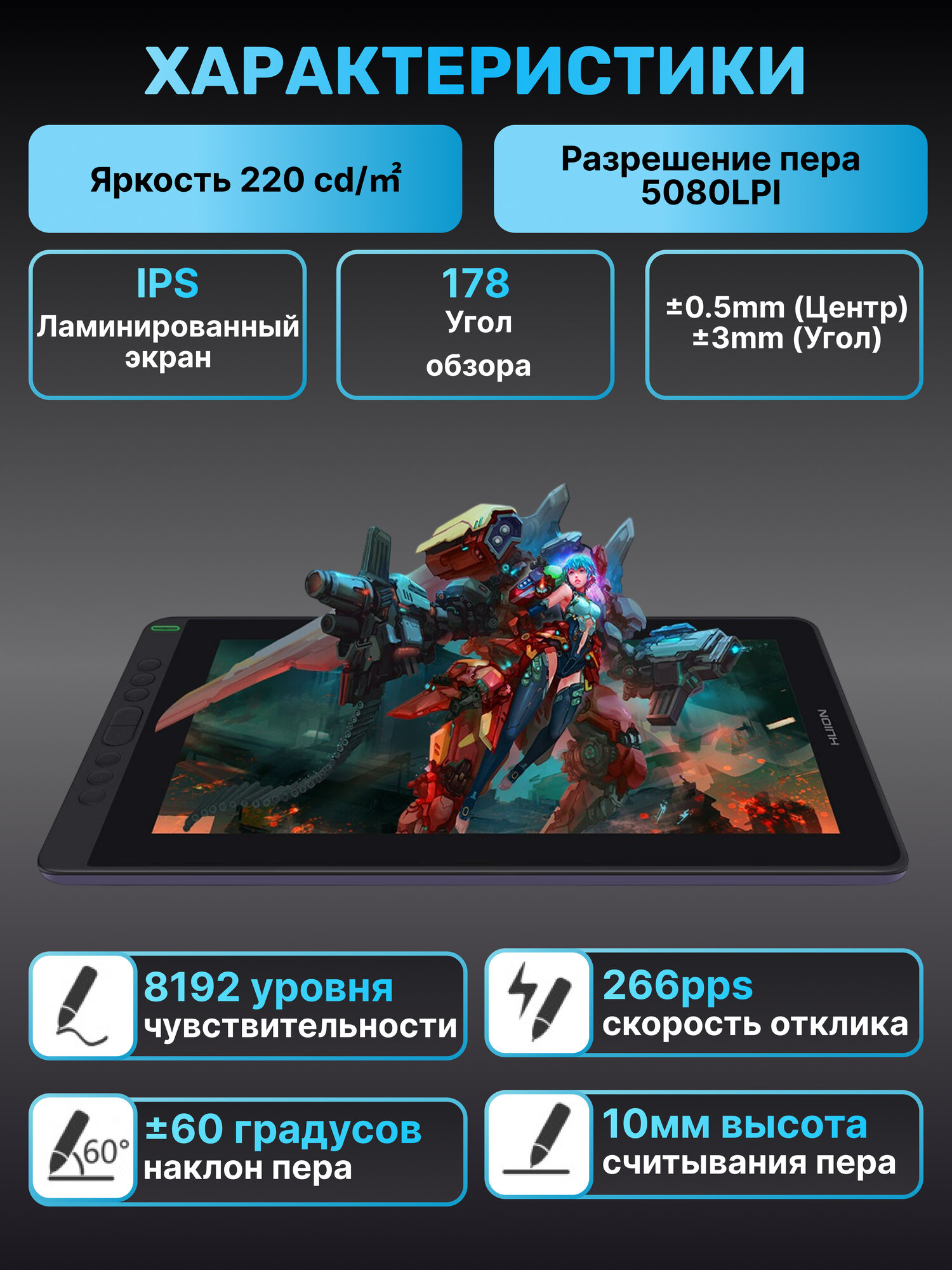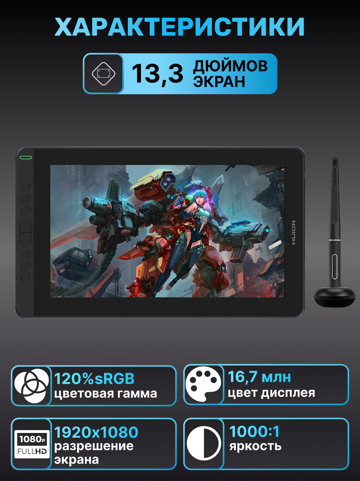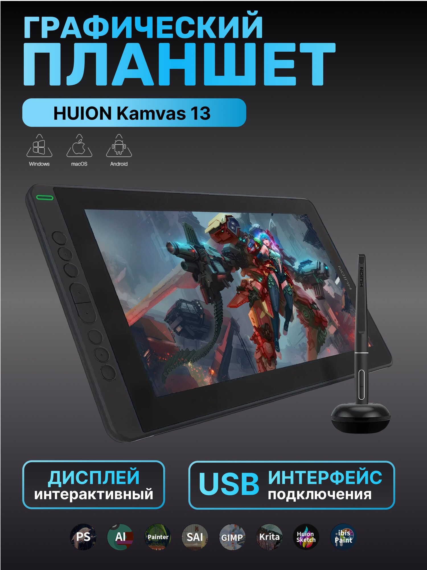 Графический планшет-монитор c экраном Huion Kamvas 13 интерактивный дисплей информация: