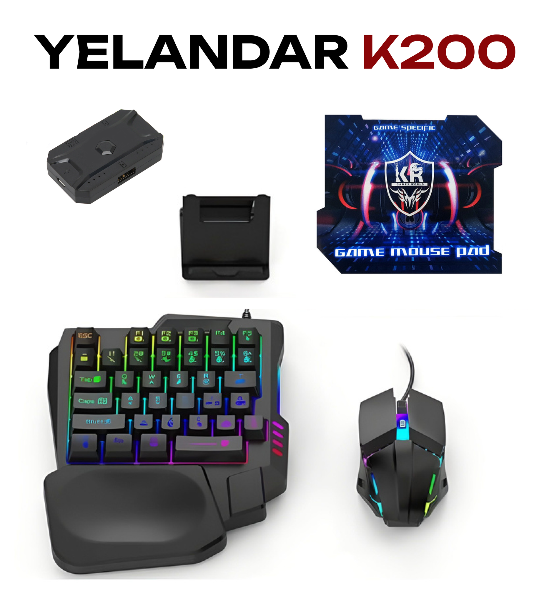 Игровой набор для телефона 5 в 1 YELANDAR K200 / Клавиатура + Мышка + Коврик + Конвертер для смартфона + Подставка информация: