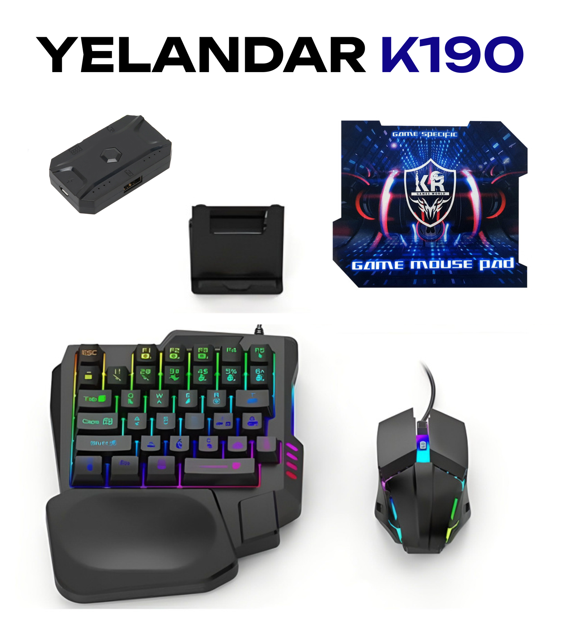 Игровой набор для телефона 5 в 1 YELANDAR K190 / Клавиатура + Мышка + Коврик + Конвертер для смартфона + Подставка информация: