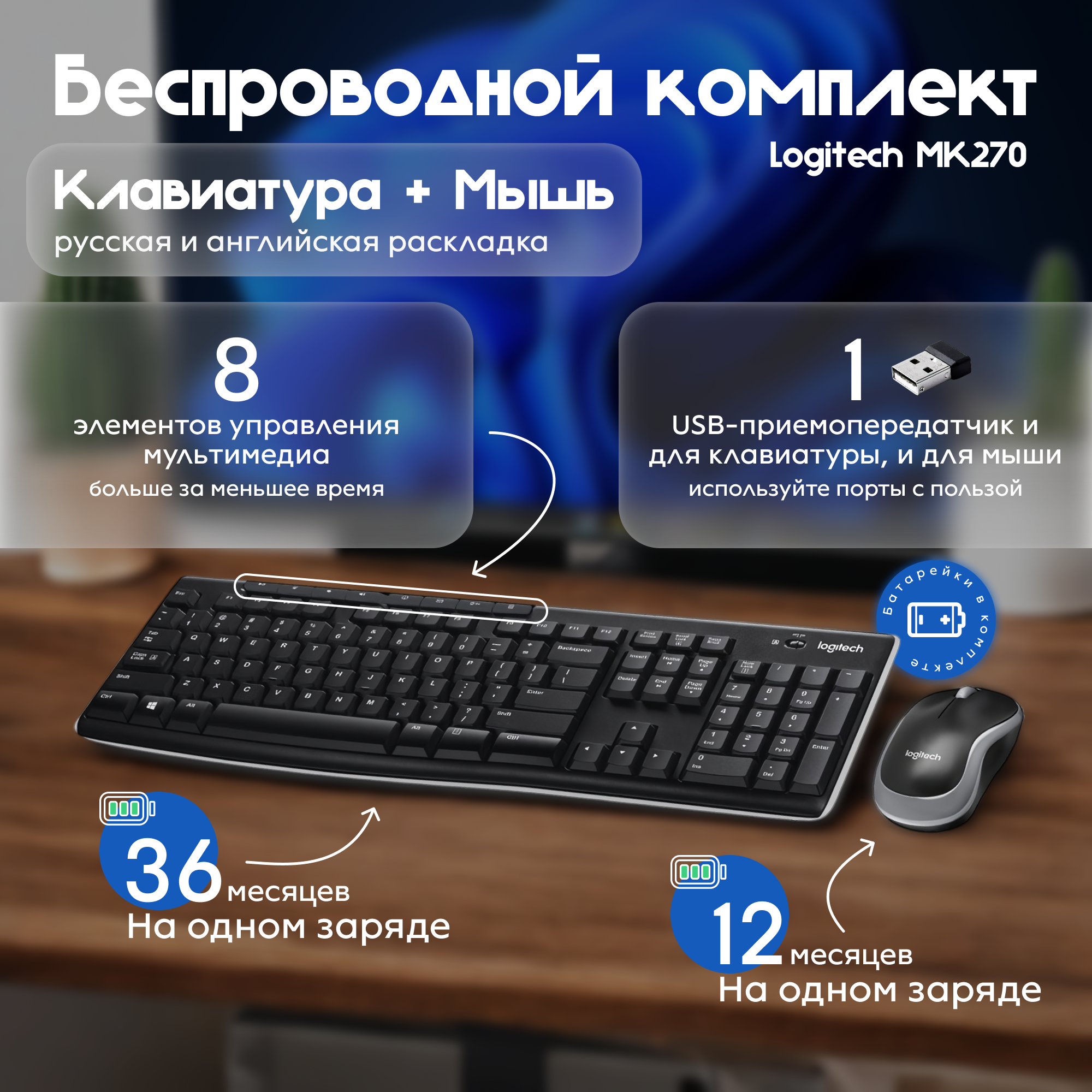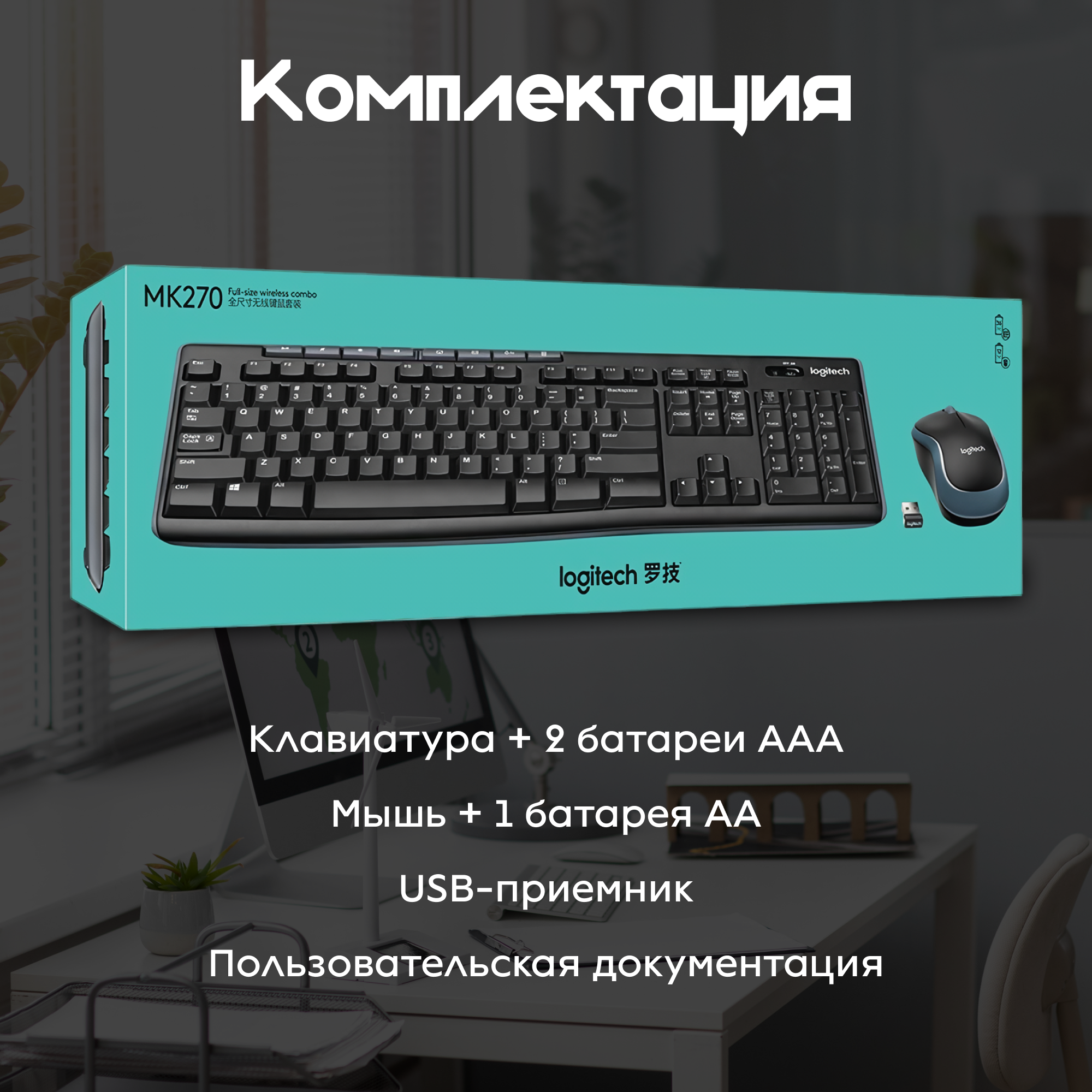 Комплект беспроводной клавиатуры и мыши Logitech MK270, клавиатура и мышь, для ПК, черный информация: