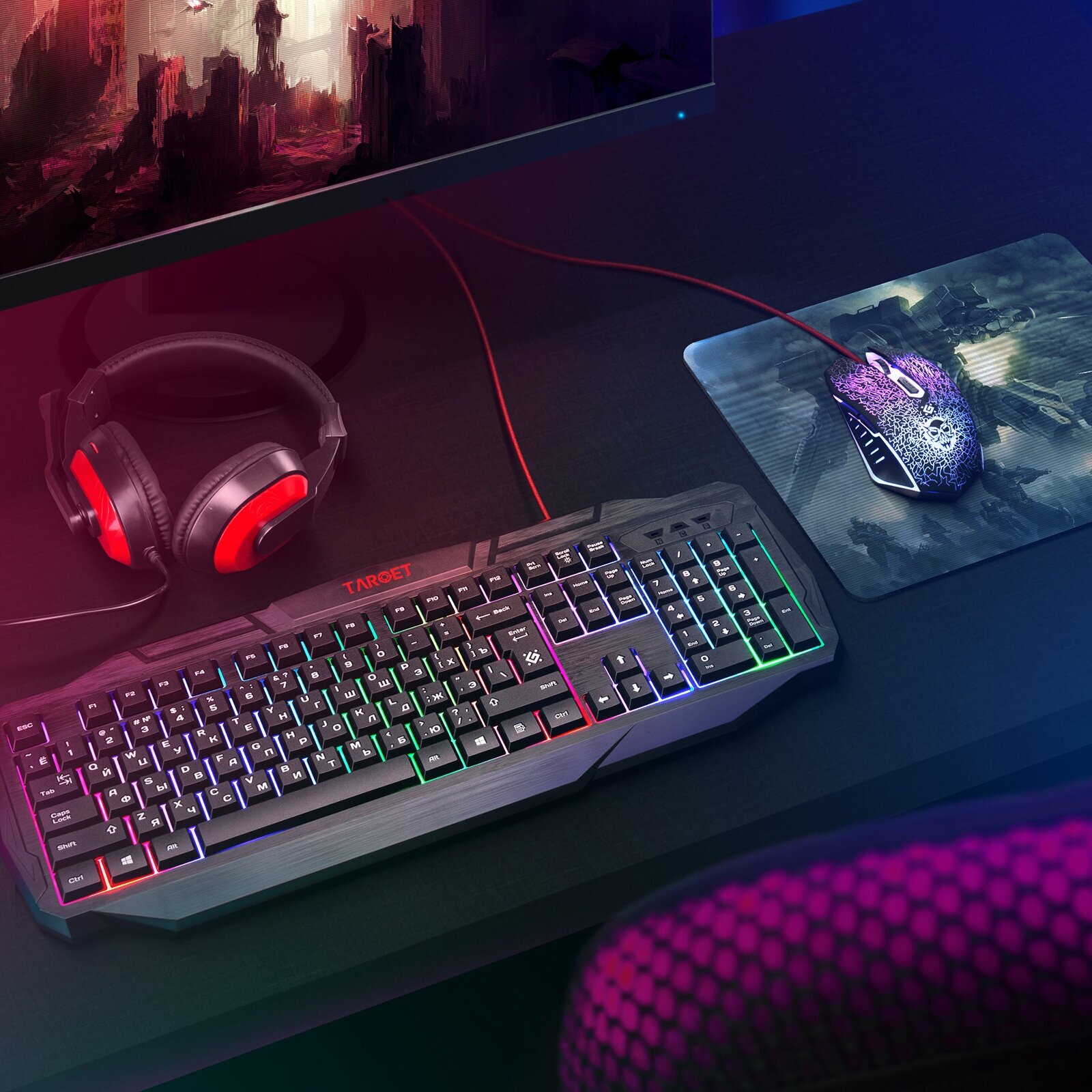 Клавиатура и мышь+коврик+наушники игровой набор для пк Defender Target информация: