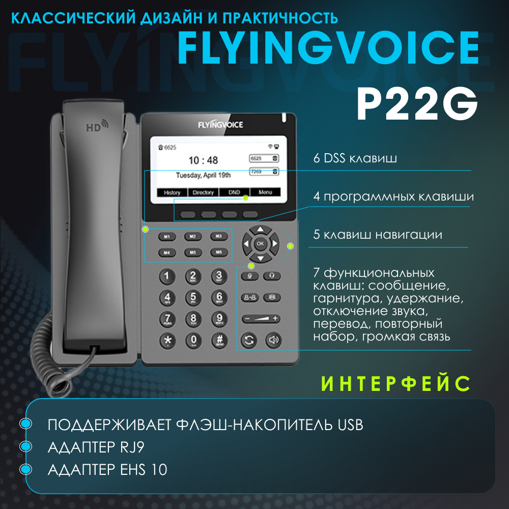 10 цен на IP-телефон FLYINGVOICE P-22G, 2 SIP аккаунта, монохромный дисплей 3,5 дюйма, 384 x 160, (RJ9)/DECT, USB, Wi-Fi, POE, 1000 Mbps.