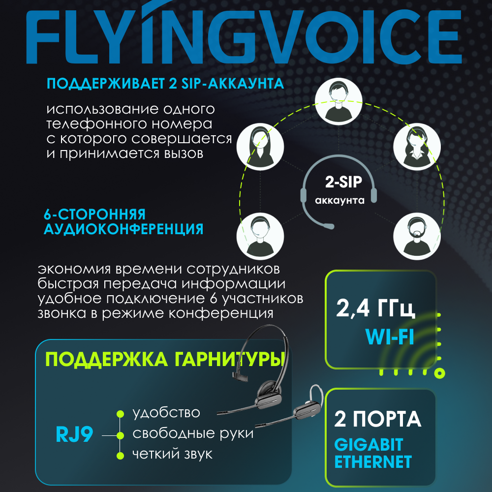 Отзывы на IP-телефон FLYINGVOICE P-22G, 2 SIP аккаунта, монохромный дисплей 3,5 дюйма, 384 x 160, (RJ9)/DECT, USB, Wi-Fi, POE, 1000 Mbps.